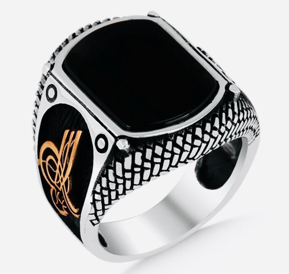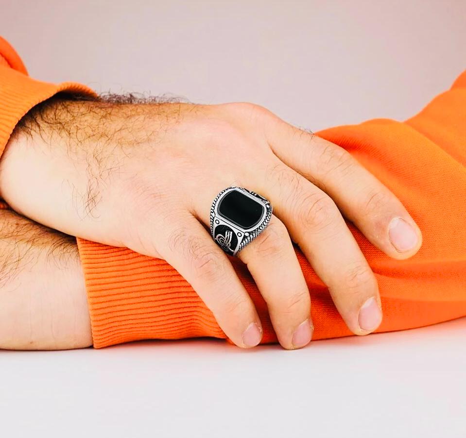 Description: This men’s ring is crafted from 925 sterling silver, featuring a polished black onyx stone and an elegant Ottoman Tughra design. The combination of the bold onyx and symbolic motif creates a striking piece, perfect for daily wear or as a unique gift. Delivered in a stylish ring box.