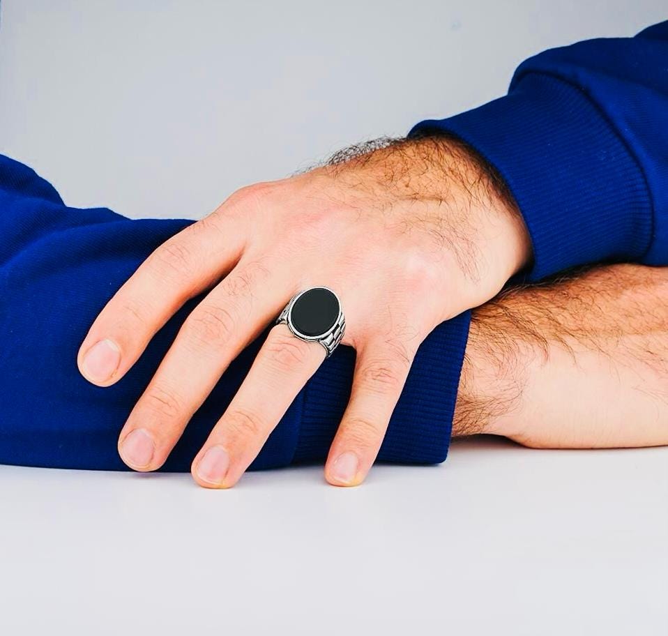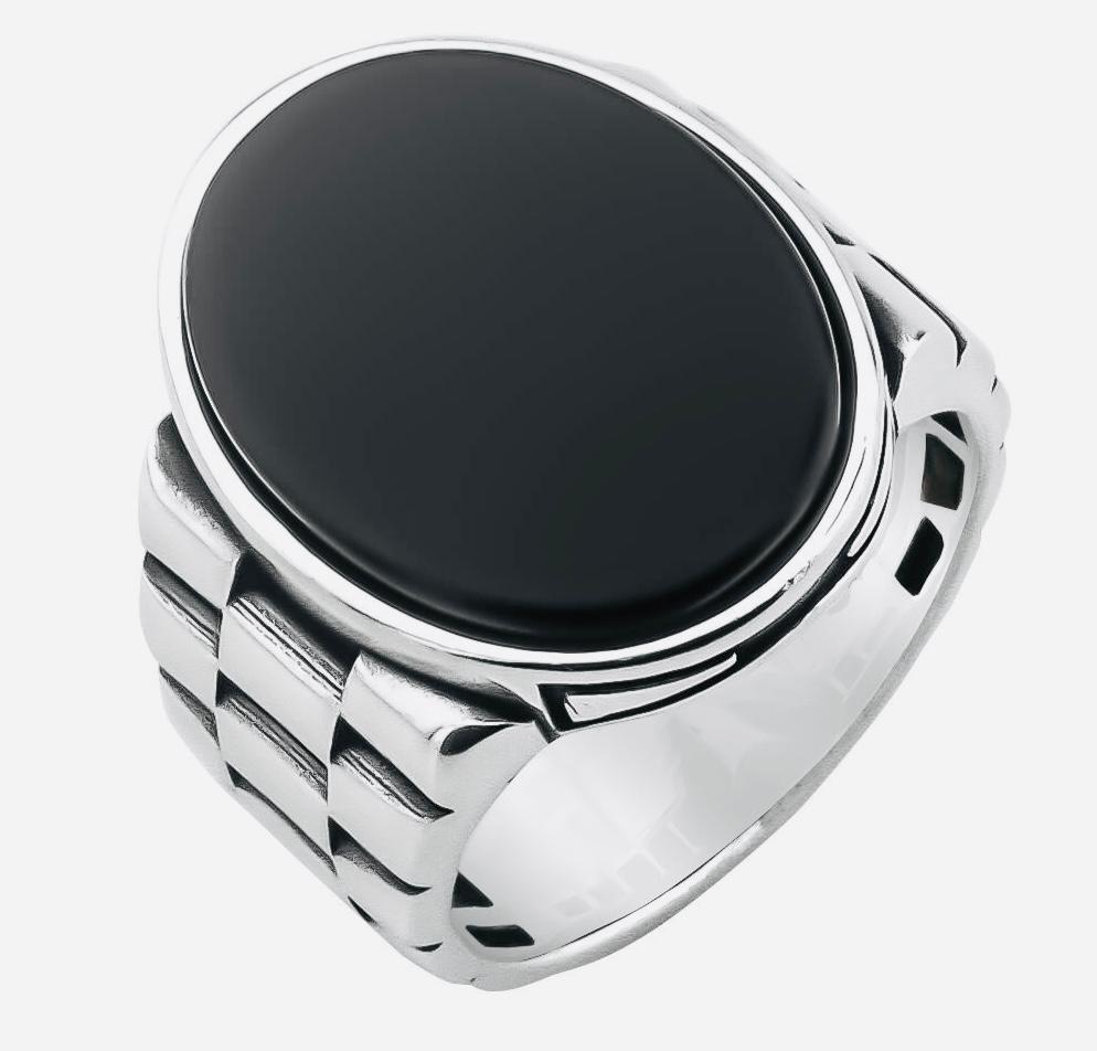 Description: This men’s ring is crafted from 925 sterling silver and features an oval Black Onyx stone set in a unique watch band-inspired design. With its polished finish and bold details, this ring is a perfect blend of strength and elegance. Ideal for daily wear or as a meaningful gift, delivered in a stylish ring box.