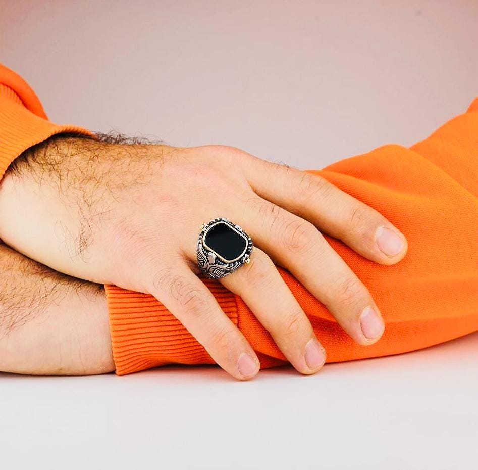 Product Details: • Material: 925 sterling silver • Stone: Black Onyx • Weight: approx. 17.1 g • Dimensions: 2 cm x 1.5 cm • Finish: Polished • Comes in a ring box