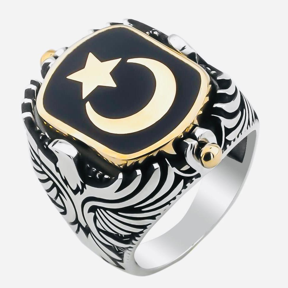 925 Sterling Silver Double-Sided Men’s Ring – Eagle Motif with Crescent Star & Black Onyx