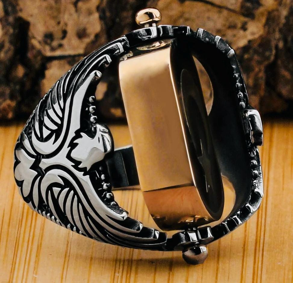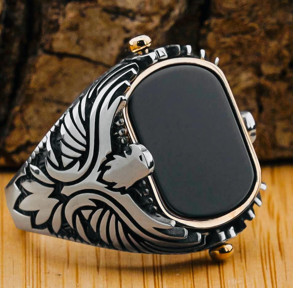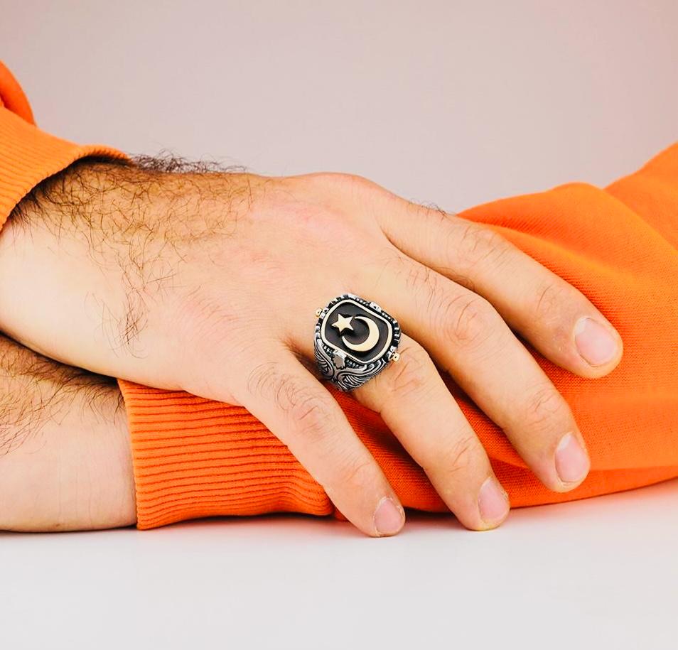 Description: This double-sided men’s ring combines the powerful symbolism of the eagle with the timeless crescent and star motif, enhanced by the bold presence of black onyx. Crafted from 925 sterling silver, it represents strength, freedom, and heritage. With its reversible design, this ring offers two looks in one, making it a versatile and meaningful accessory. Delivered in an elegant ring box, it also makes a distinctive gift for him.
