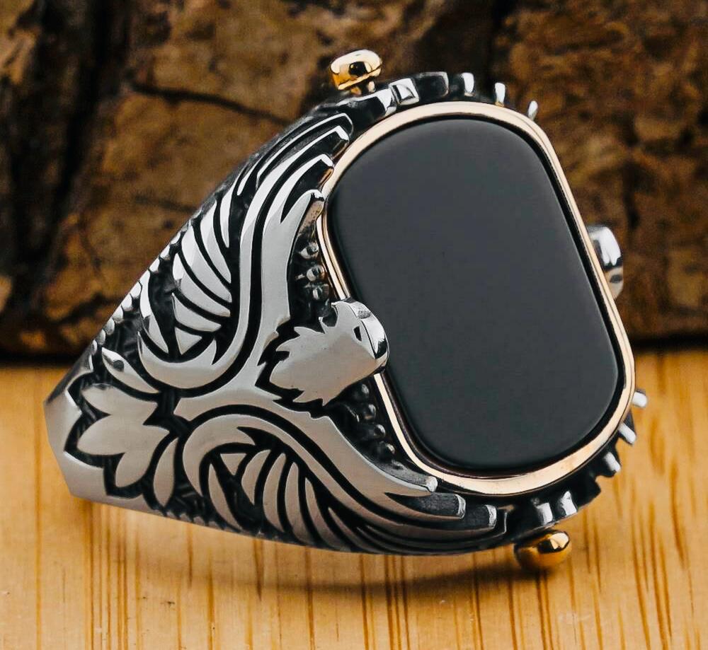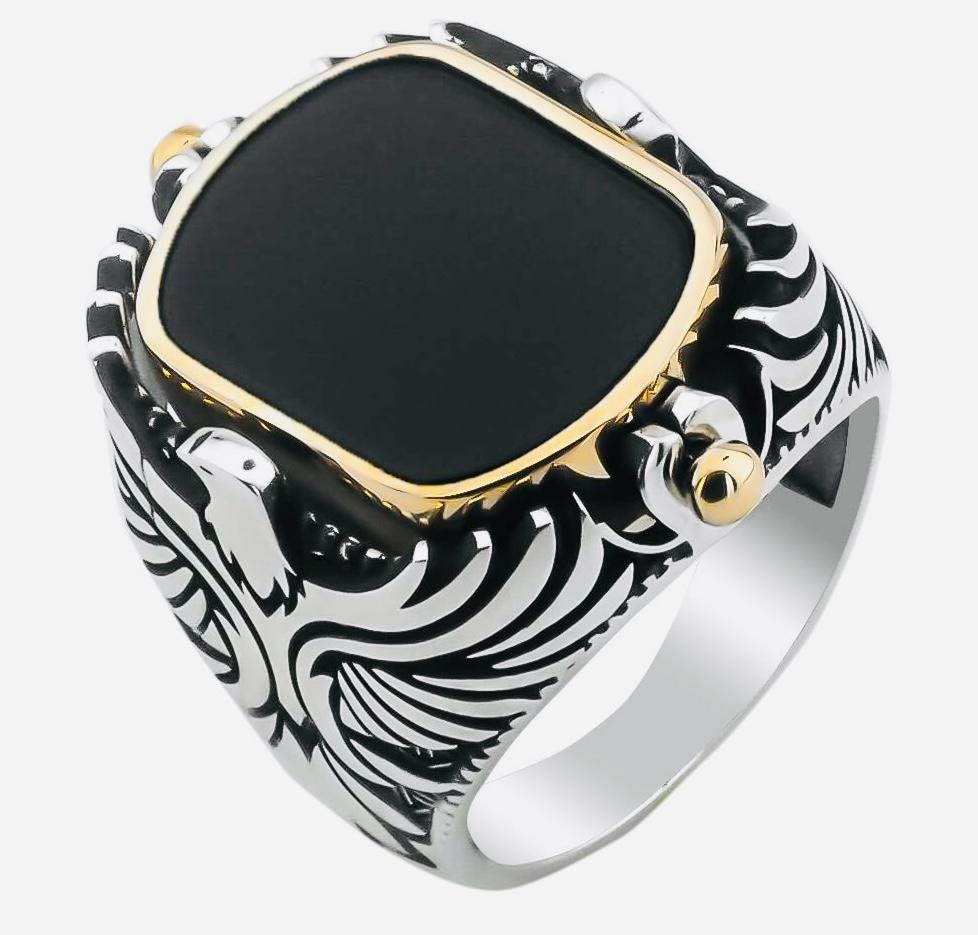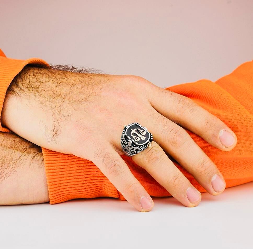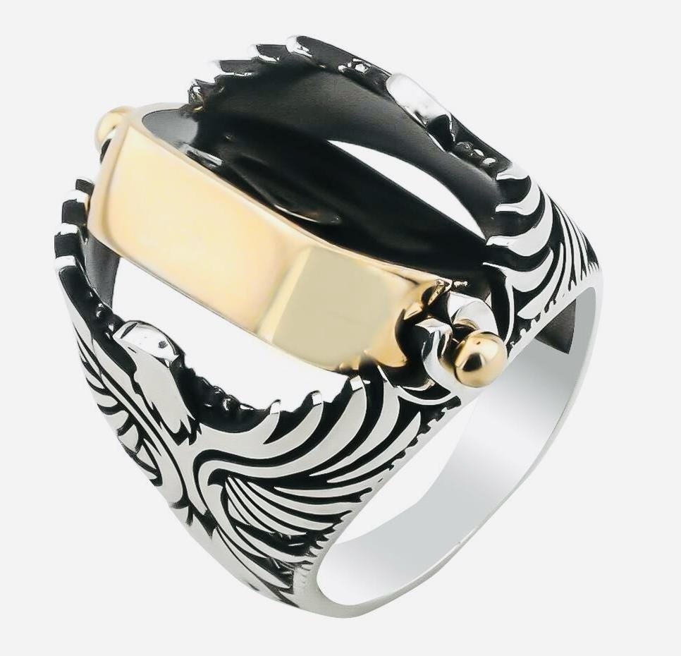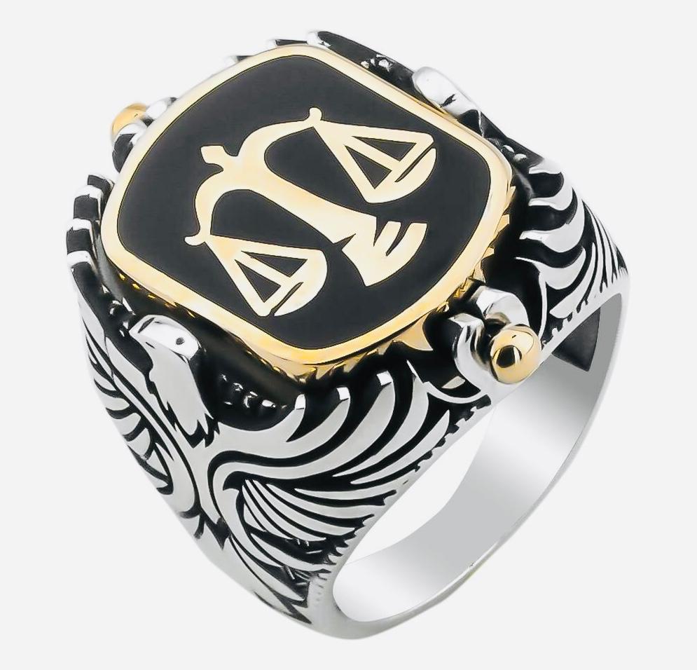 Description: This unique double-sided men’s ring blends two powerful symbols: the scales of justice and the eagle, both enhanced by the timeless elegance of black onyx. Crafted from 925 sterling silver, it embodies balance, strength, and freedom. With its reversible design, it offers versatility—two bold styles in one. Delivered in a stylish ring box, it makes a meaningful and symbolic gift for men.