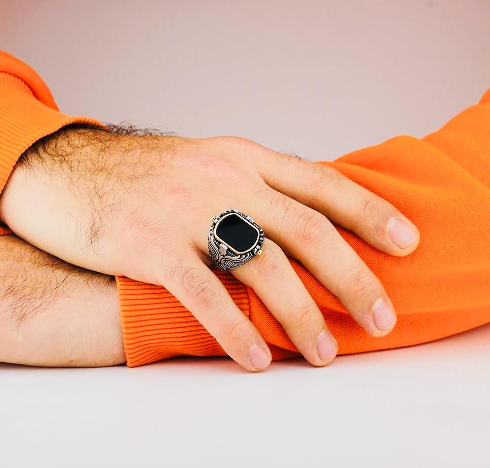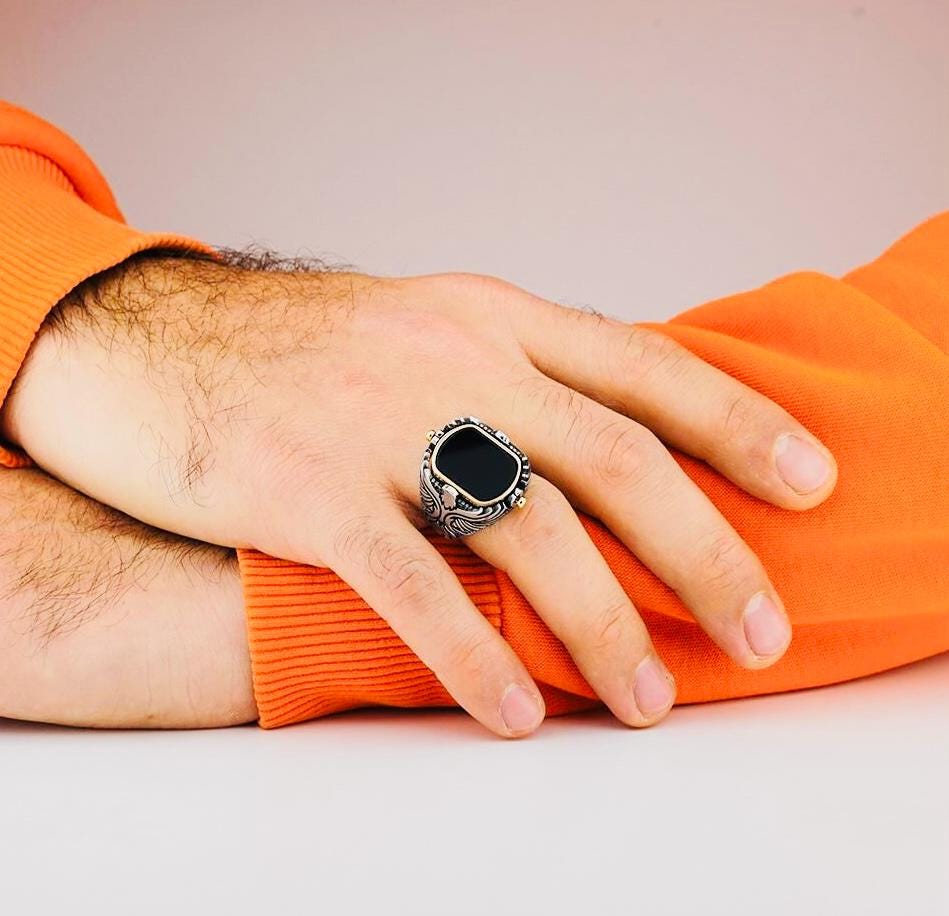 Product Details: • Material: 925 sterling silver • Stone: Black Onyx • Weight: approx. 16.8 g • Dimensions: 2 cm x 1.5 cm • Finish: Polished • Comes in a ring box