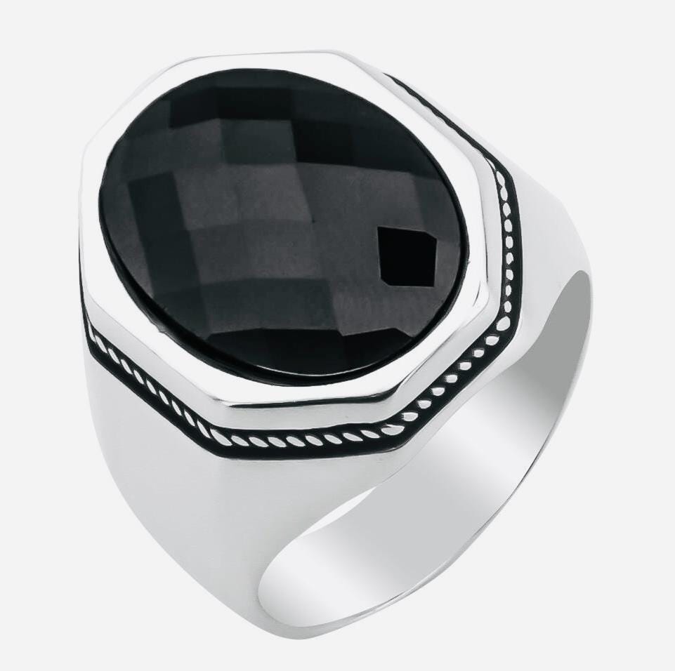 925 Sterling Silver Men’s Ring with Black Zircon – Octagon Design