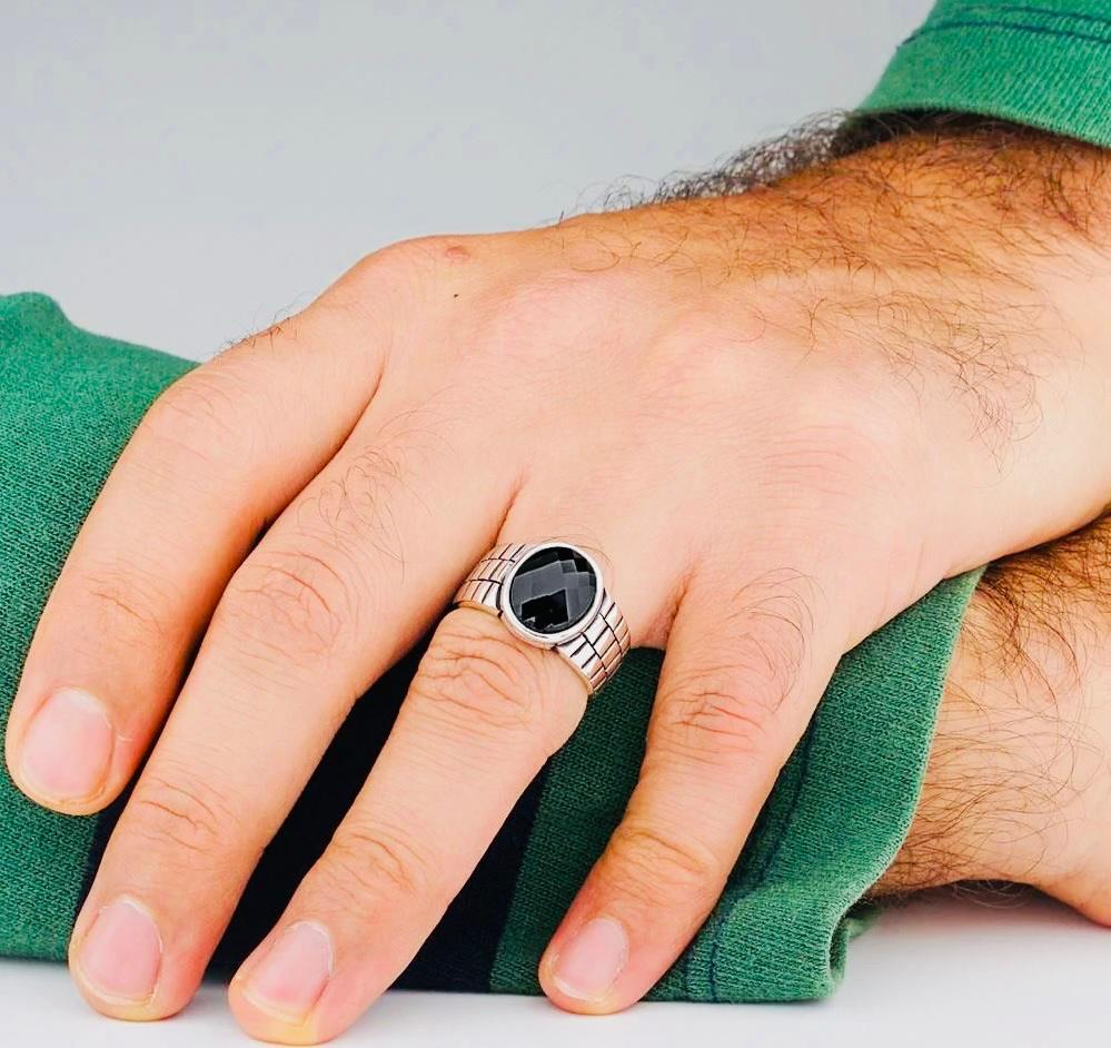 Product Details: • Material: 925 sterling silver • Stone: Faceted zircon • Stone color: Black • Stone size: 1 cm x 1.3 cm • Weight: approx. 9.7 g (may vary by size) • Finish: Polished • Origin: Turkey • Comes in a ring box