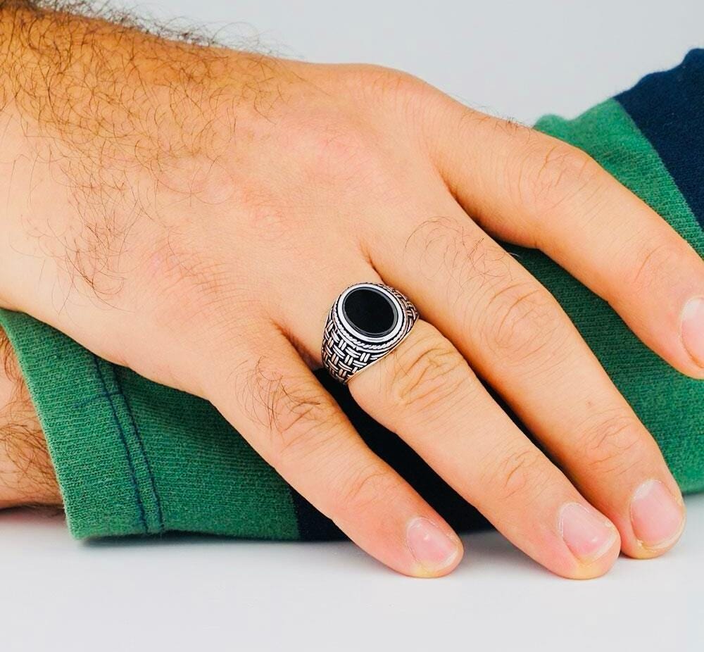 Product Details: • Material: 925 sterling silver • Stone: Onyx • Stone color: Black • Stone size: 1 cm x 1.30 cm • Weight: approx. 9.1 g (may vary by size) • Finish: Polished • Origin: Turkey • Comes in a ring box