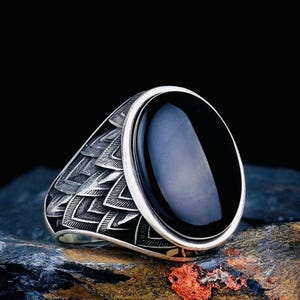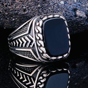 Product Details: • Material: 925 sterling silver • Stone: Zircon (black onyx look) • Stone color: Black • Weight: approx. 9 g (may vary by size) • Finish: Polished • Origin: Turkey • Production: Mold crafted • Comes in a ring box
