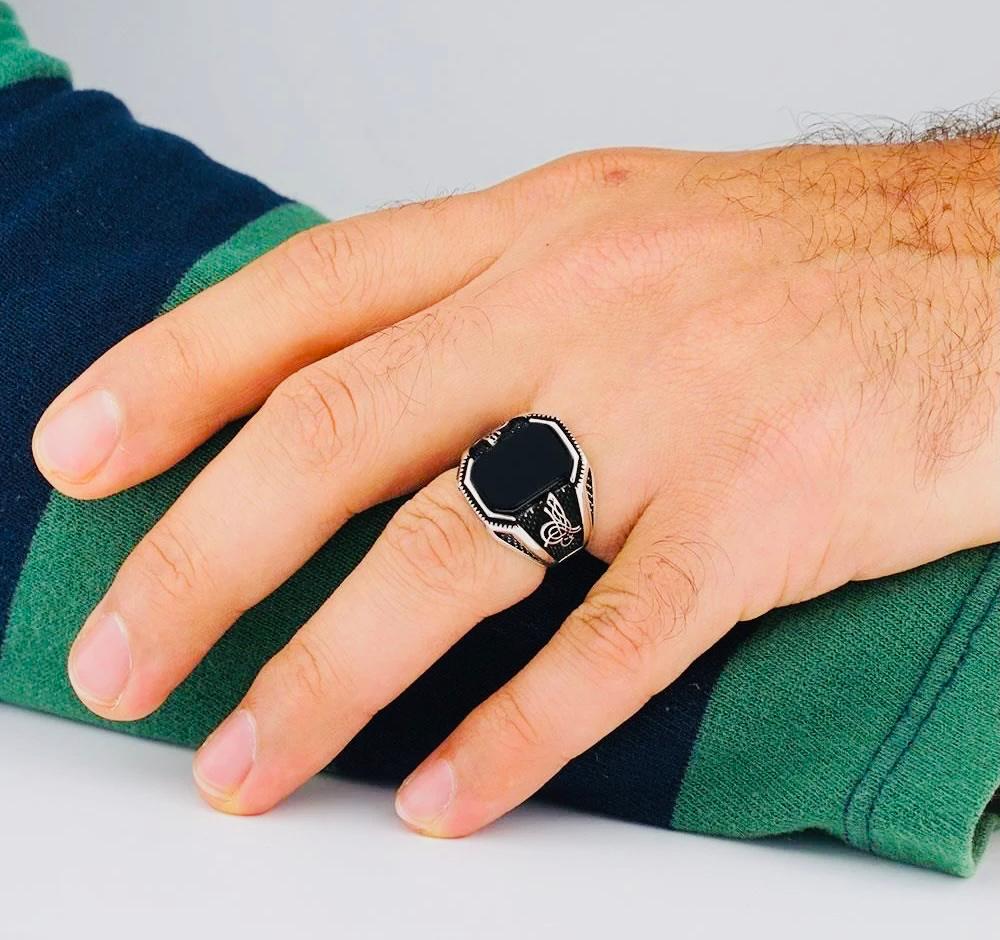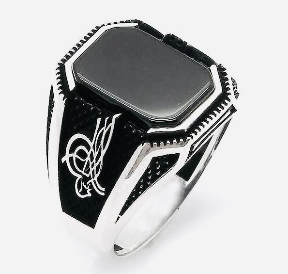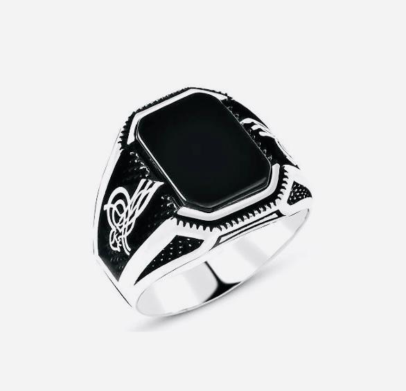 925 Sterling Silver Men’s Ring with Black Onyx and Ottoman Tughra Design