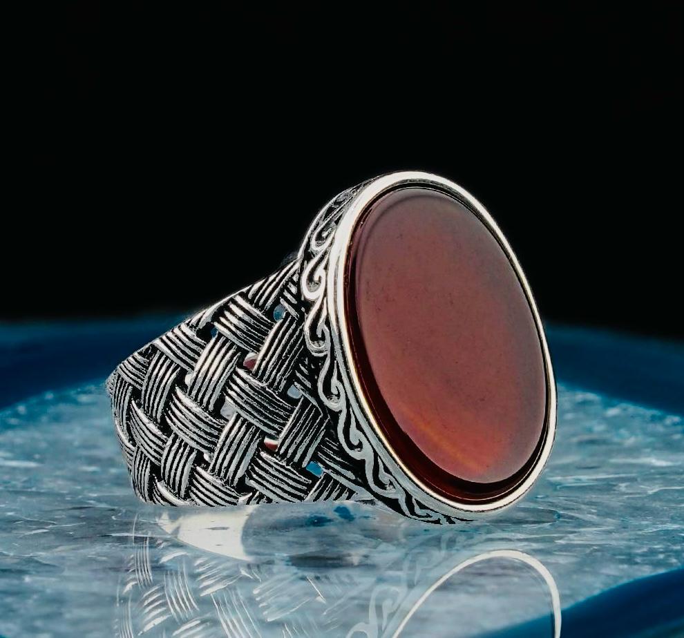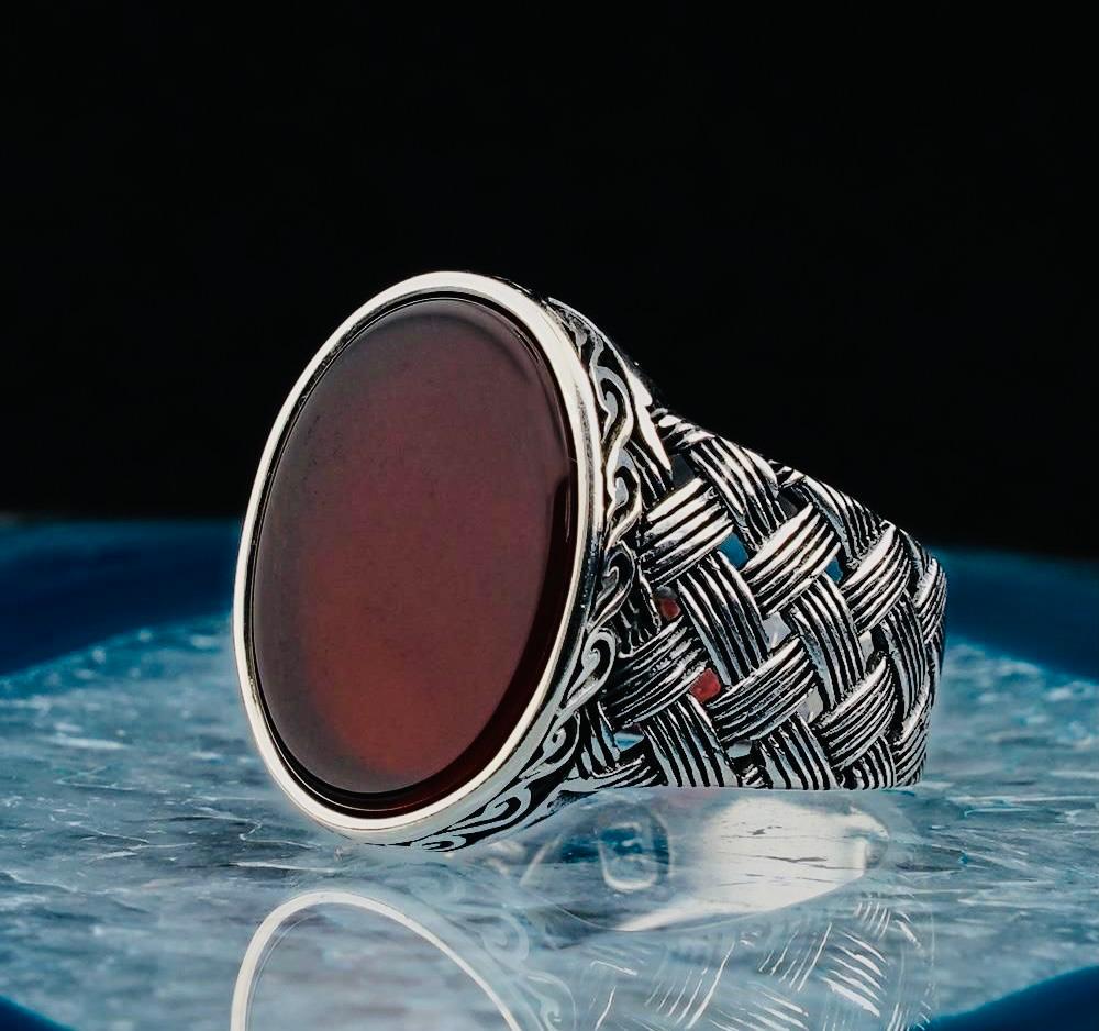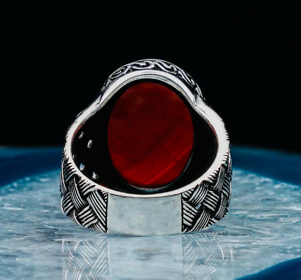 Product Details: • Material: 925 sterling silver • Stone: Red Agate • Shape: Oval • Design: Braided pattern • Weight: approx. 10 g (may vary by size) • Origin: Turkey • Comes in a ring box