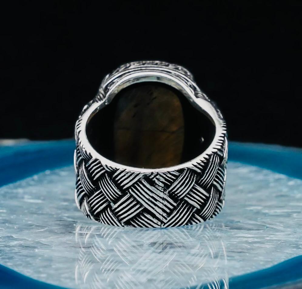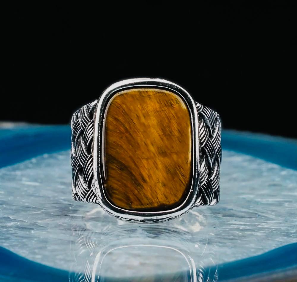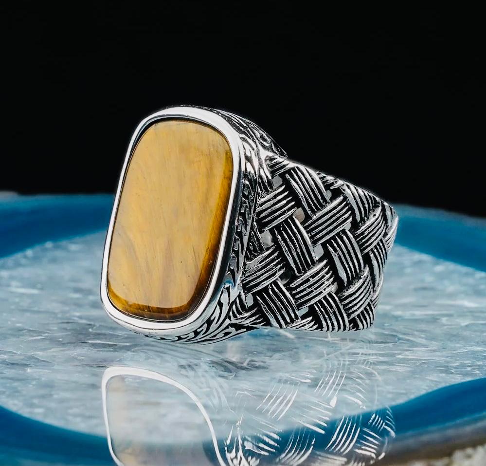 Description: This men’s ring is crafted from 925 sterling silver and showcases a striking rectangular tiger eye stone framed with a braided pattern design. Known for its protective and grounding properties, the tiger eye stone adds both elegance and strength to the ring. Perfect for daily wear or special occasions, it arrives in a stylish ring box, making it an ideal gift for him.
