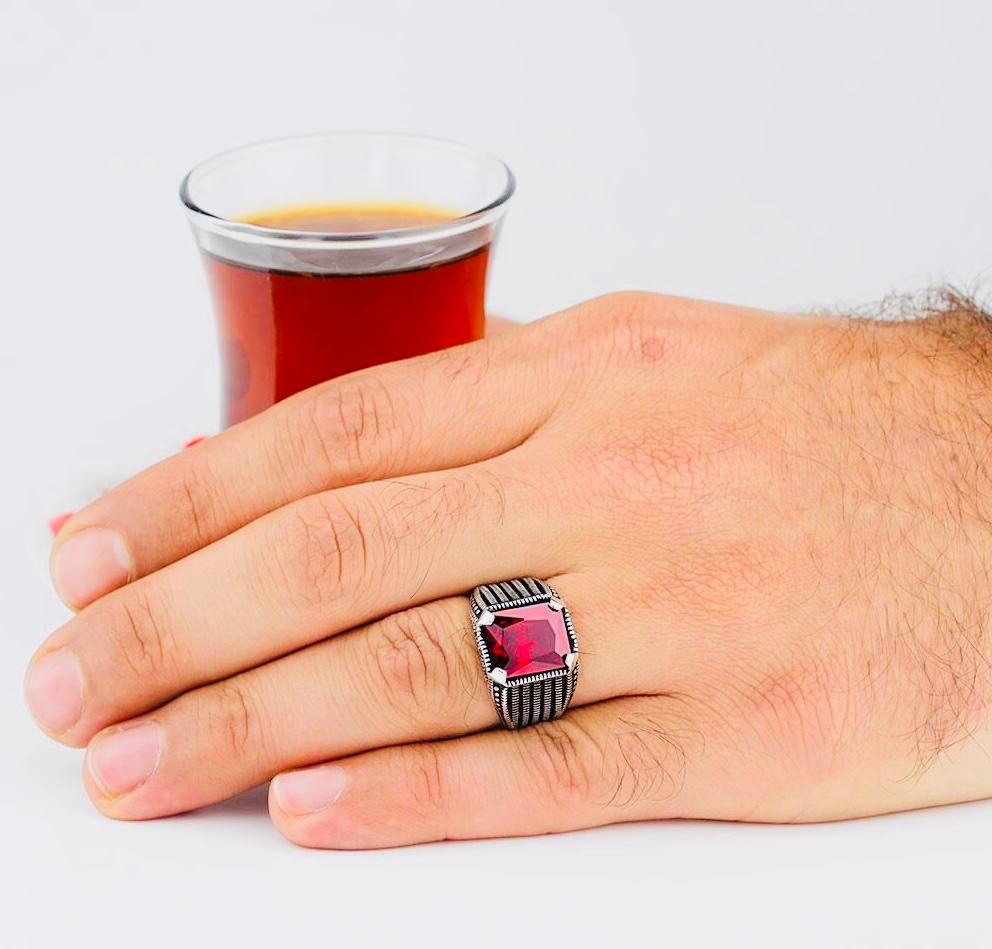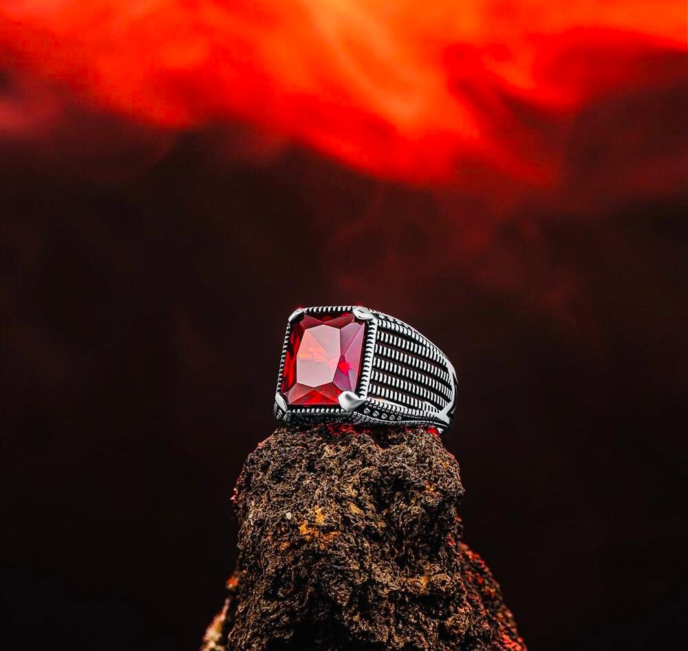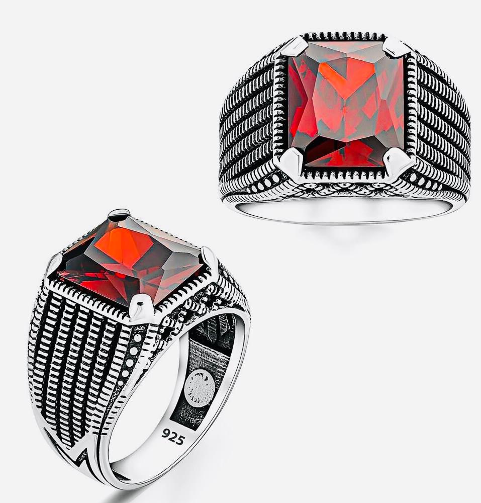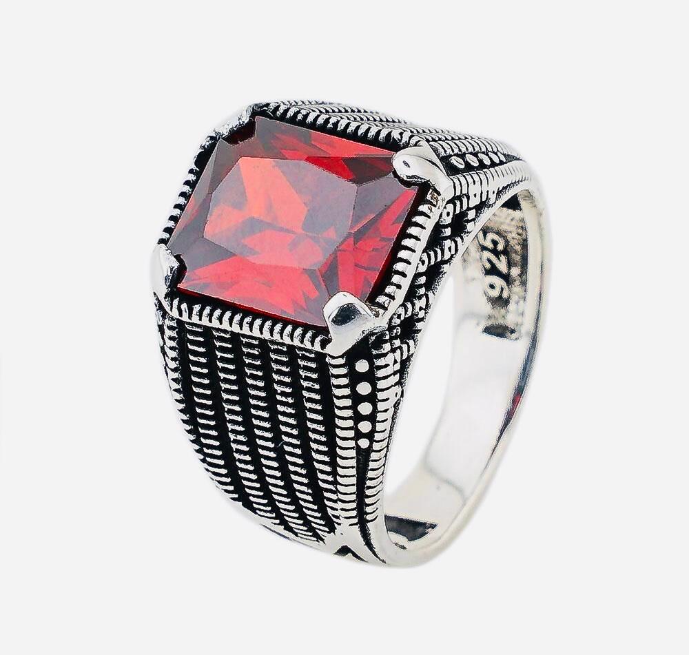 Product Details: • Material: 925 sterling silver (hallmarked) • Stone: Zircon • Stone color: Red • Weight: approx. 7.75 g (may vary by size) • Finish: Polished • Origin: Turkey • Comes in a ring box