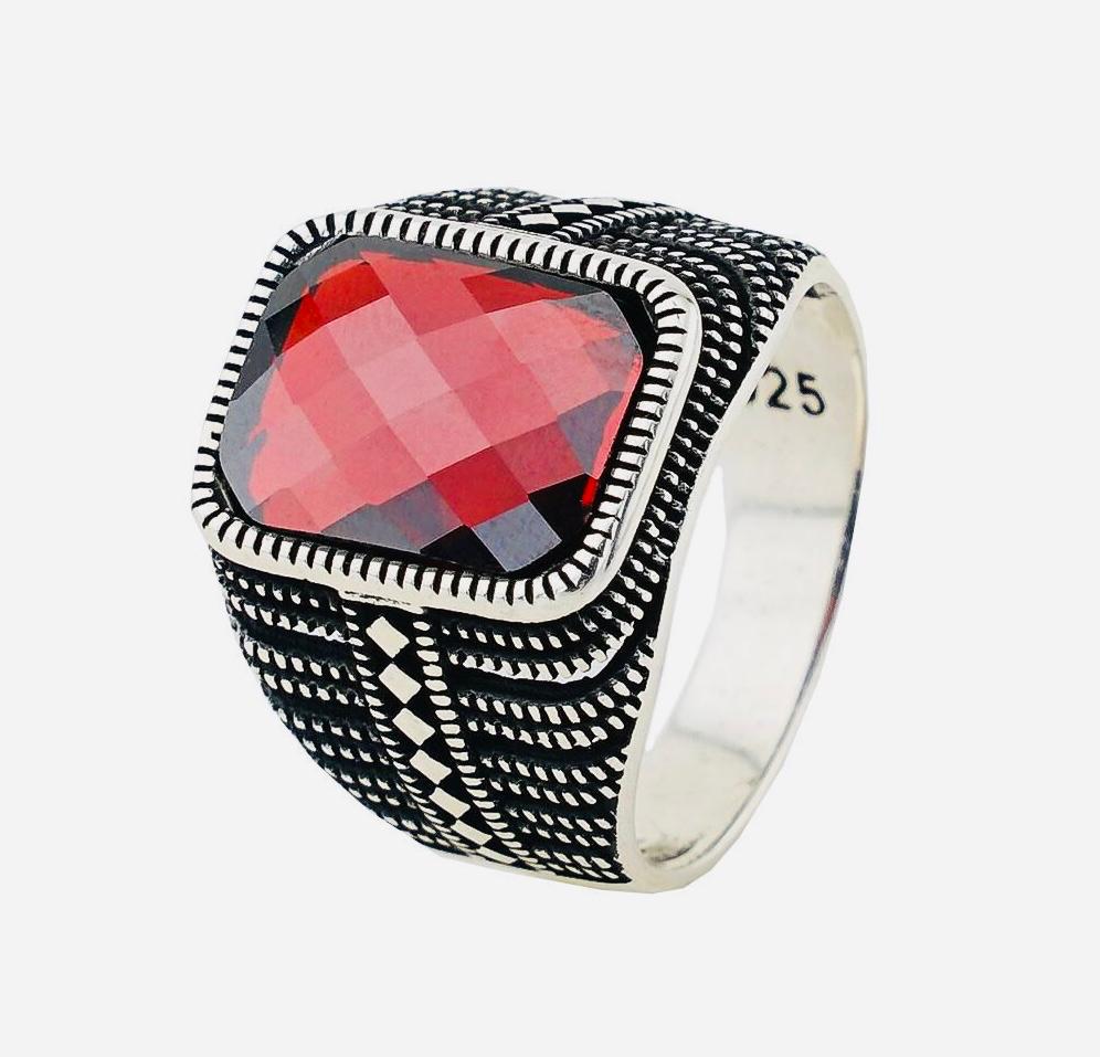 Product Details: • Material: 925 sterling silver (hallmarked) • Stone: Zircon • Stone color: Red • Cut: Faceted • Weight: approx. 8.95 g (may vary by size) • Finish: Polished • Origin: Turkey • Comes in a ring box
