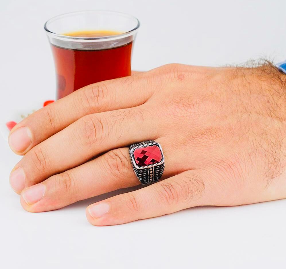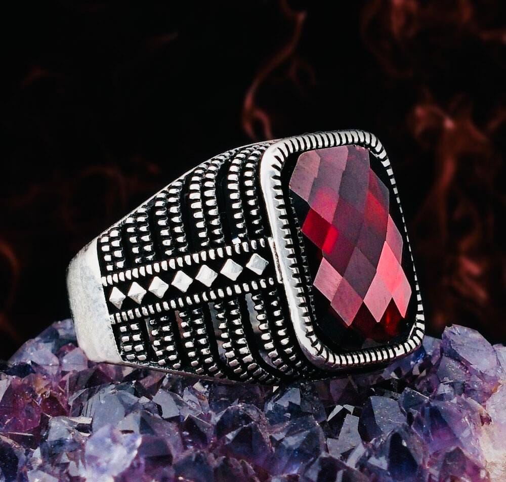 Description: This men’s ring is made of 925 sterling silver and features a faceted red zircon stone that radiates elegance and strength. Its polished finish and bold design make it a versatile accessory, perfect for everyday wear or formal occasions. Packaged in an elegant ring box, it also makes a meaningful gift for him.