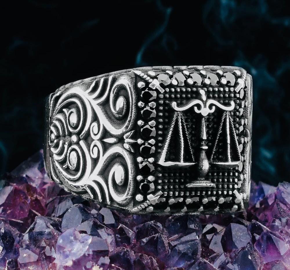 Product Details: • Material: 925 sterling silver (hallmarked) • Design: Justice Scales motif • Stones: Black micro stones • Weight: approx. 10.80 g (may vary by size) • Finish: Polished • Origin: Turkey • Comes in a ring box