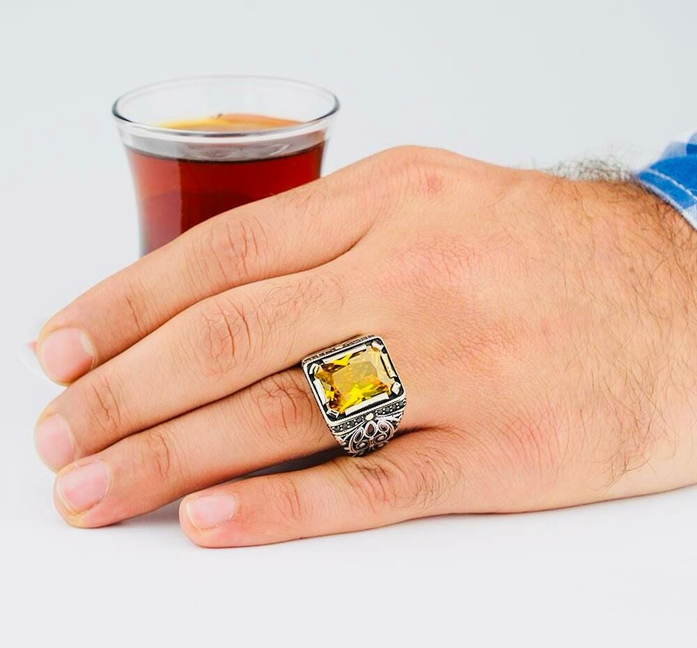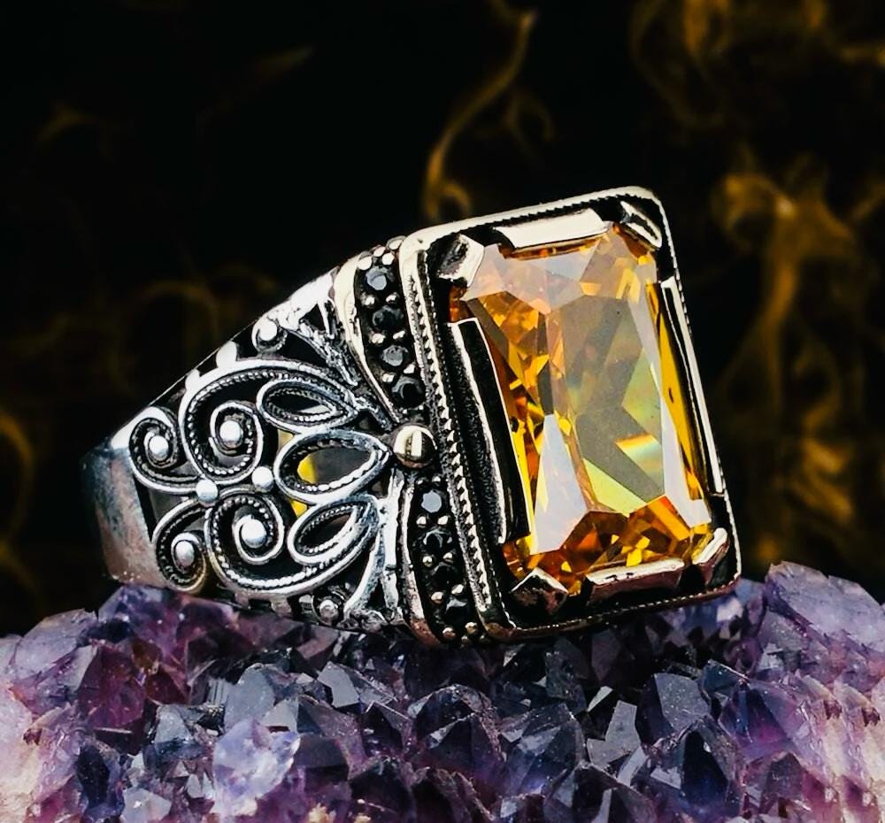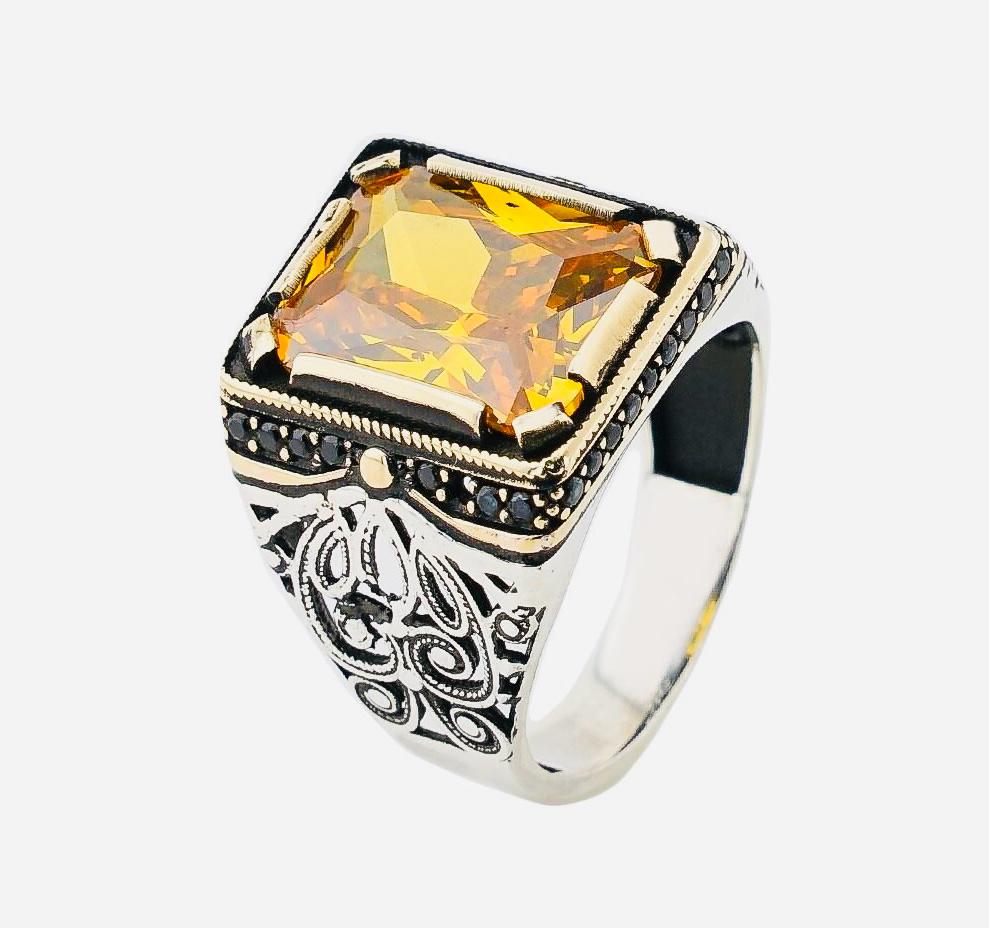 Product Details: • Material: 925 sterling silver (hallmarked) • Stones: Yellow zircon & black nano stones • Weight: approx. 11.45 g (may vary by size) • Finish: Polished • Origin: Turkey • Comes in a ring box
