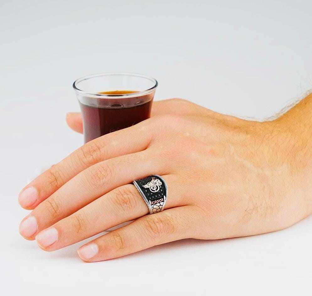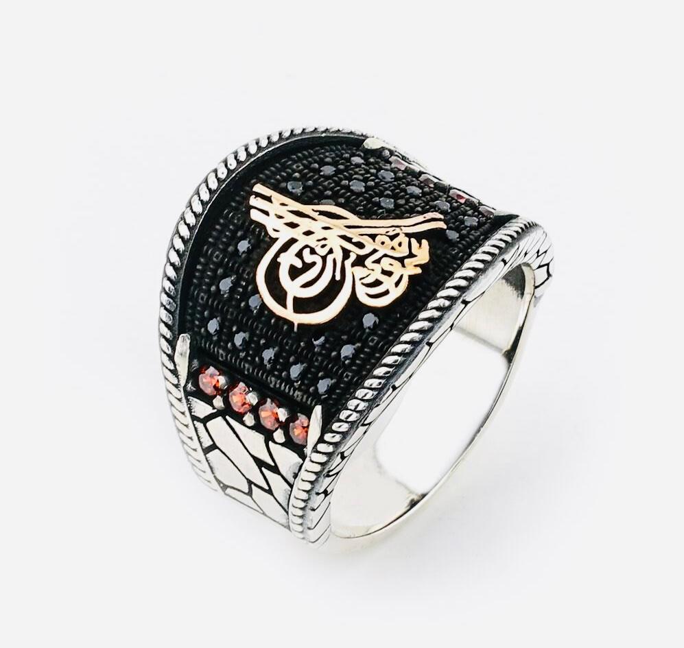 Description: 925 sterling silver men’s ring featuring an intricate Ottoman Tughra design, adorned with shimmering black and red micro stones. Its polished finish and symbolic motif create a bold yet elegant accessory. Perfect for both everyday wear and special occasions, this piece is delivered in a ring box, making it a meaningful gift option.
