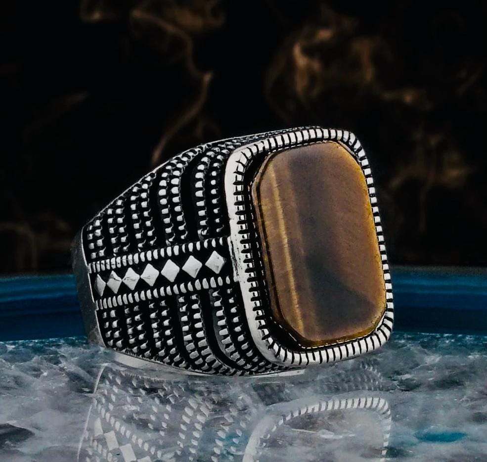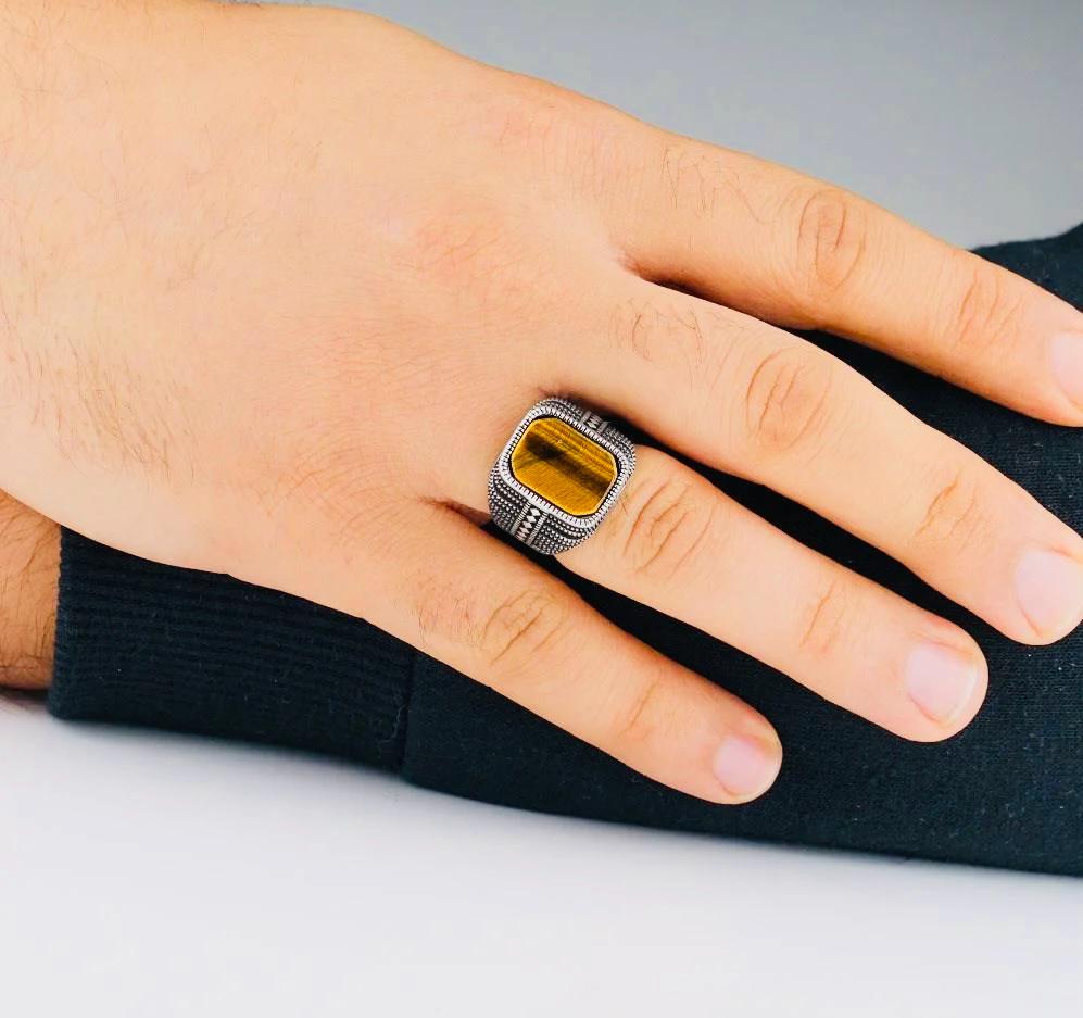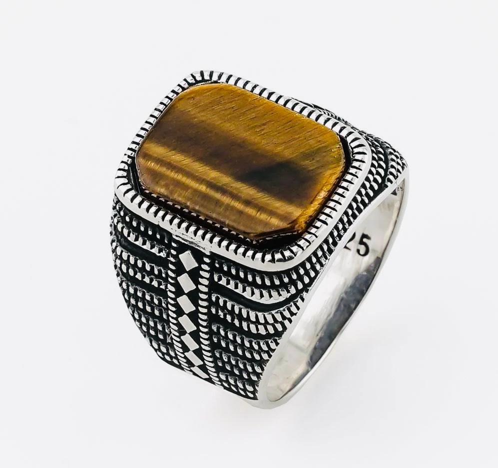 Product Details: • Material: 925 sterling silver • Stone: Tiger Eye • Stone color: Brown • Stone size: 1.4 cm x 1 cm • Weight: approx. 8 g (may vary by size) • Finish: Polished • Origin: Turkey • Comes in a gift-ready ring box