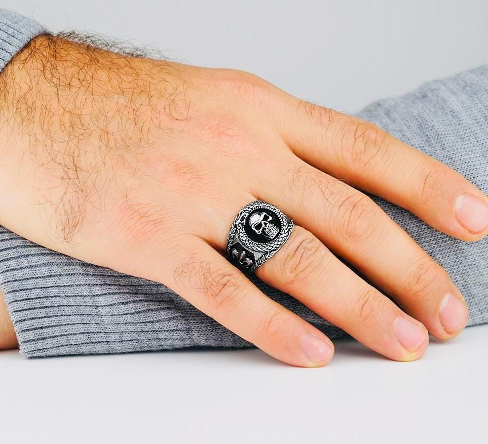 Product Details: • Material: 925 sterling silver • Design: Skull & Snake • Size: 1.8 cm x 1.8 cm • Weight: approx. 10.9 g (may vary by size) • Finish: Polished • Origin: Turkey • Comes in a ring box