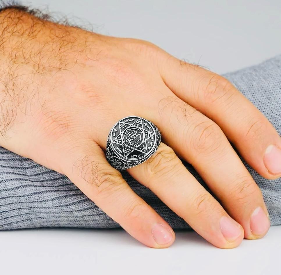 Product Details: • Material: 925 sterling silver • Design: Seal of Solomon Engraved • Size: 2.2 cm diameter • Weight: approx. 14.9 g (may vary by size) • Finish: Polished • Origin: Turkey • Comes in a ring box