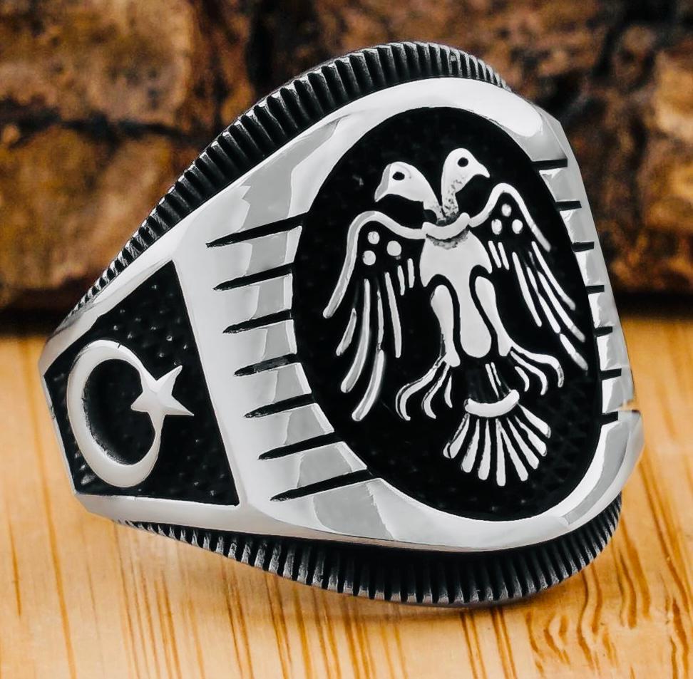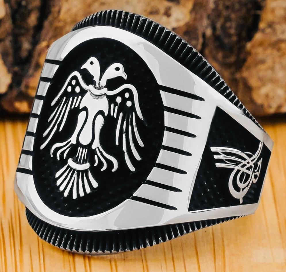 925 Sterling Silver Men’s Ring with Double-Headed Seljuk Eagle – 8.8 g