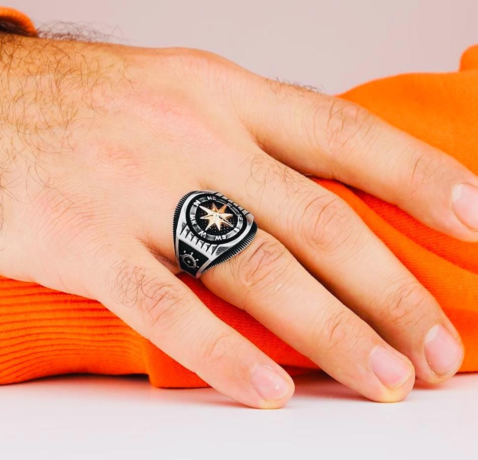 Product Details: • Material: 925 sterling silver • Design: Compass, wheel & anchor motif • Size: 2 cm x 1.8 cm • Weight: approx. 8.4 g (may vary by size) • Finish: Polished • Origin: Turkey • Casting production • Comes in a ring box