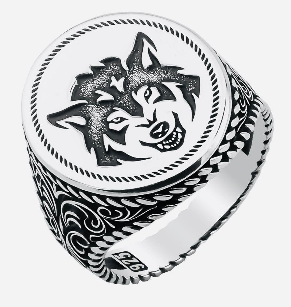 Product Details: • Material: 925 sterling silver • Design: Wolf motif • Size: 1.9 cm x 2.1 cm • Weight: approx. 8.2 g (may vary by size) • Finish: Polished • Origin: Turkey • Comes in a ring box