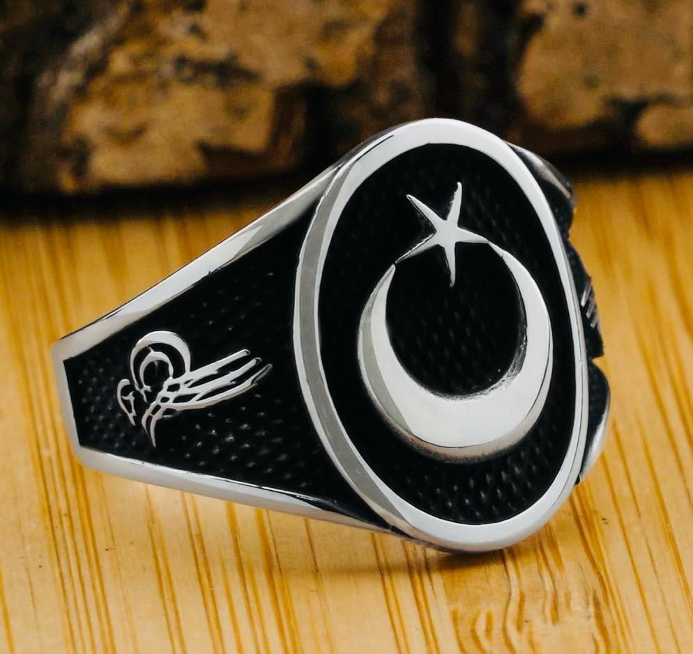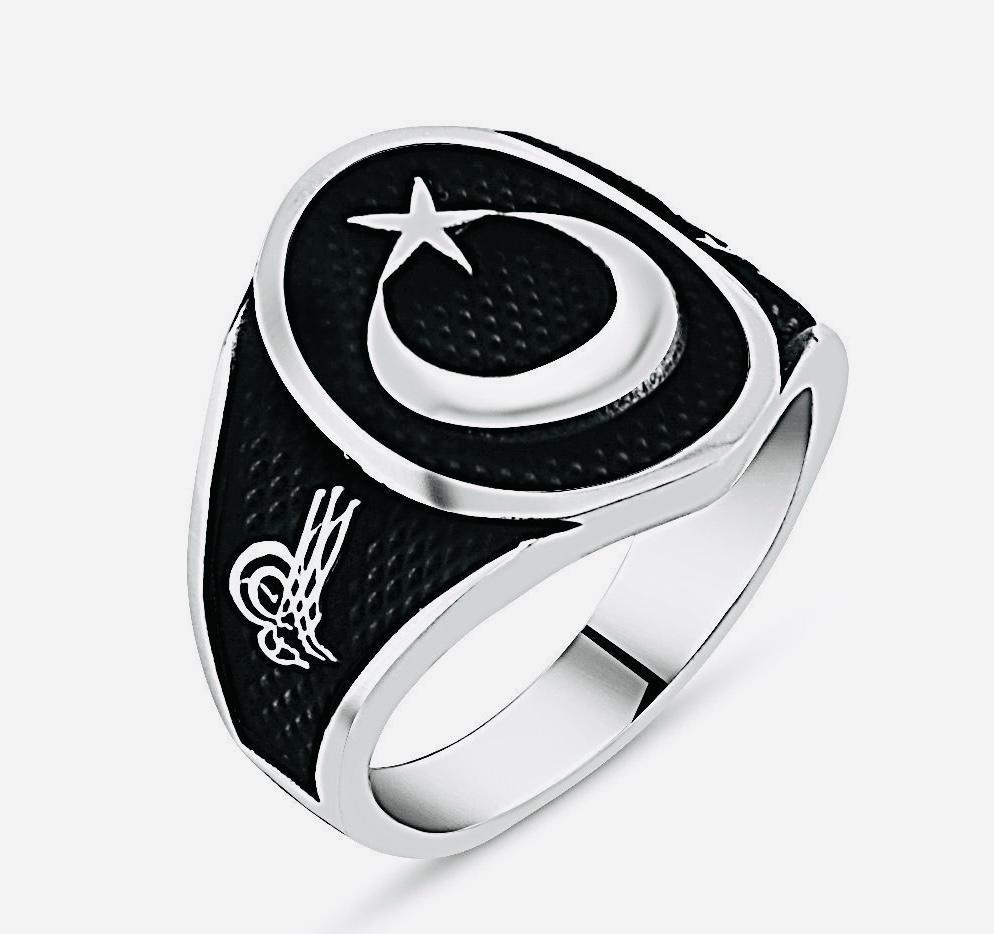 Product Details: • Material: 925 sterling silver • Design: Crescent and Star motif • Stone: None • Weight: approx. 9 g (may vary by size) • Finish: Polished • Origin: Turkey • Comes in a ring box