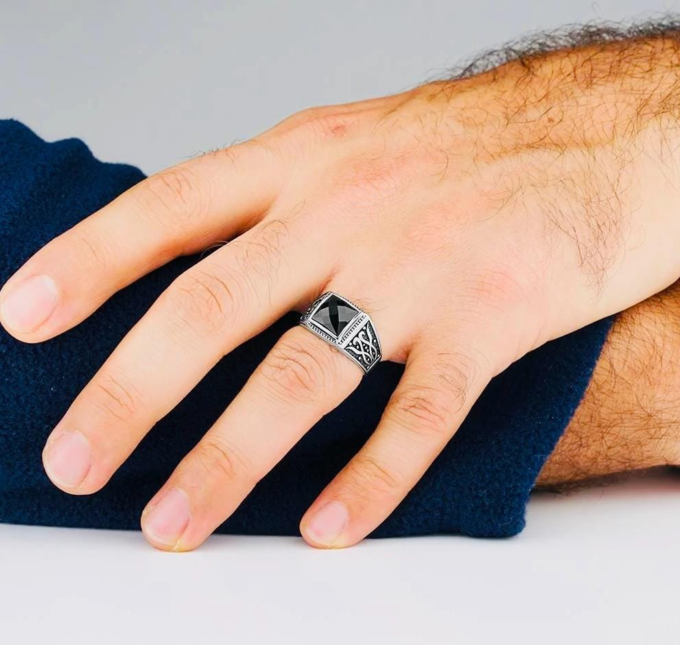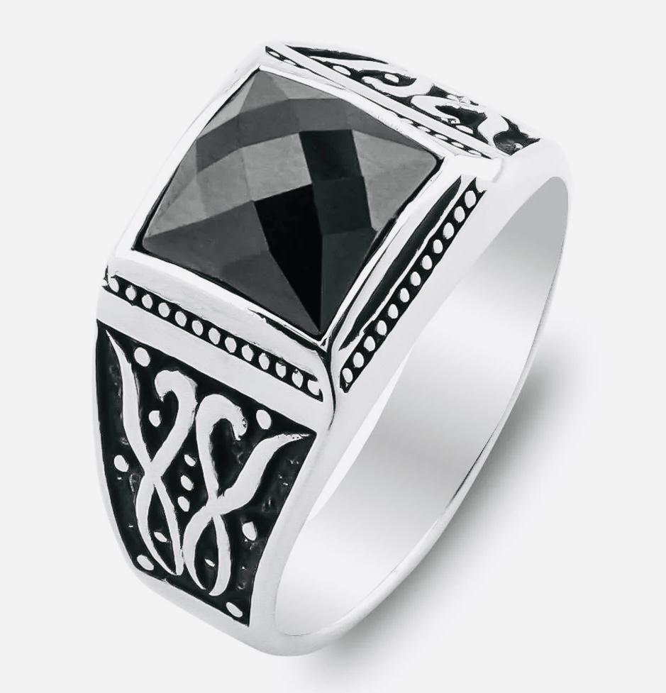 Description: This men’s ring is crafted from 925 sterling silver and features a polished black zircon stone with a detailed patterned design. Its elegant style makes it perfect for both everyday wear and formal occasions. Delivered in a ring box, it also makes a thoughtful gift for someone special.