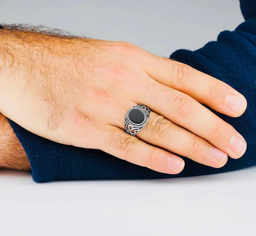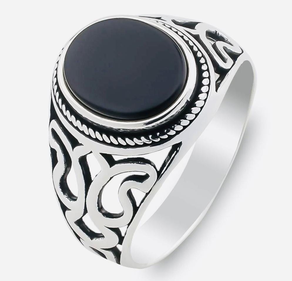 Product Details: • Material: 925 sterling silver • Stone: Black Onyx • Design: Oval with detailed patterns • Weight: approx. 6.4 g (may vary by size) • Size: 1.0 x 1.2 cm • Finish: Polished • Origin: Turkey • Production: Mold-crafted • Comes in a ring box
