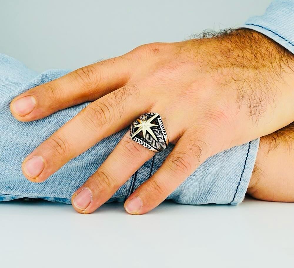 Product Details: • Material: 925 sterling silver • Design: North Star motif • Weight: approx. 11.5 g (may vary by size) • Size: 2.2 cm x 2 cm • Finish: Polished • Origin: Turkey • Comes in a ring box