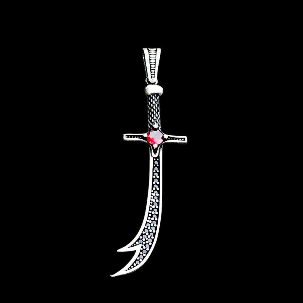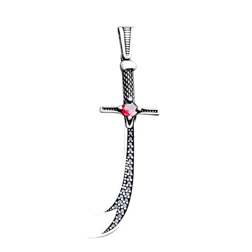 925 Sterling Silver Pendant with Red Stone – La Feta İlla Ali La Seyfe İlla Inscription – Zulfiqar Design – 6.50 g