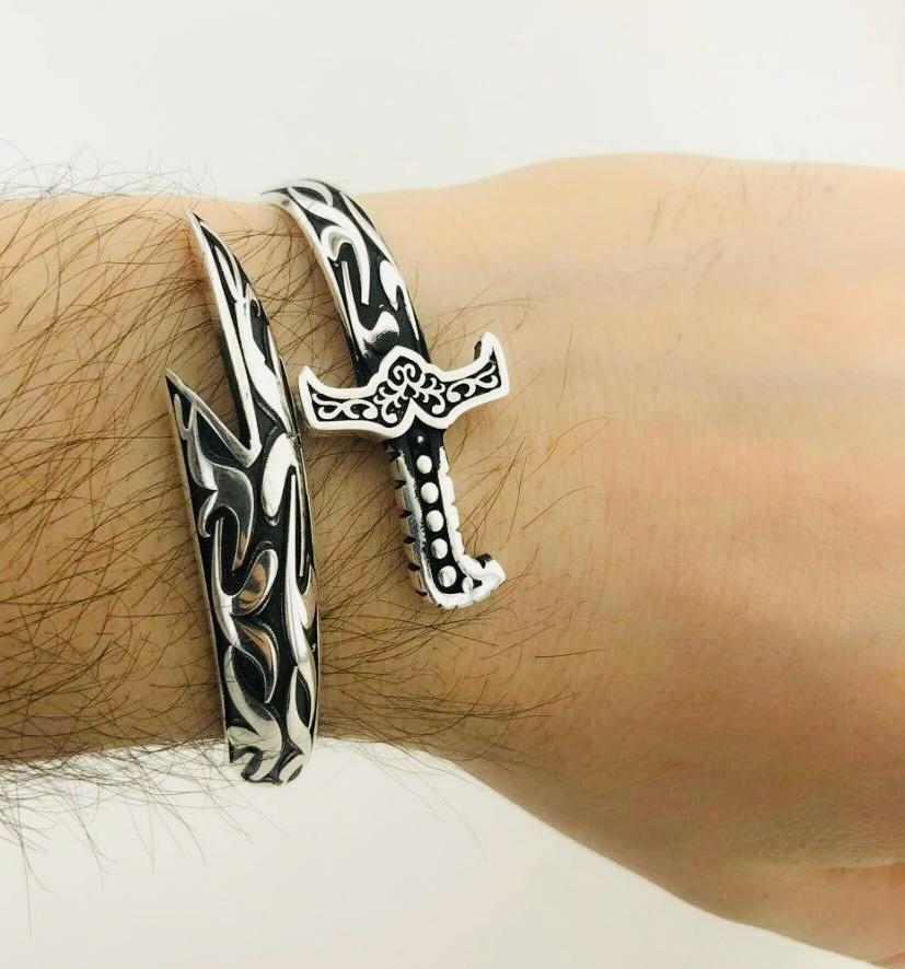Adjustable 925 Sterling Silver Men’s Cuff Bracelet with Zülfikar Sword Design – 29.15 g