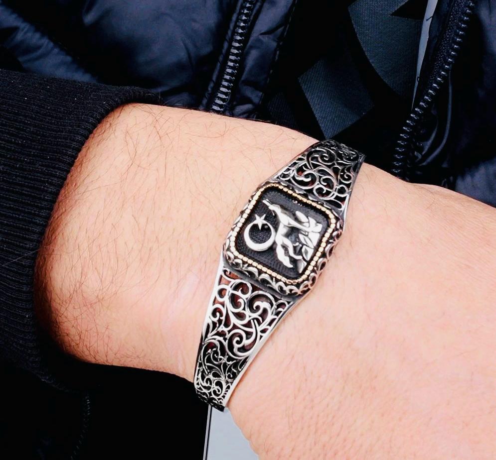 Description: The Grey Wolf, a sacred symbol in Turkic culture, represents freedom, courage, and guidance. This adjustable men’s cuff bracelet is crafted from 925 sterling silver and designed with a striking wolf motif. With its polished finish and cultural significance, it makes a bold accessory for both everyday wear and special occasions. Delivered in a stylish bracelet box, it also makes a meaningful gift choice.