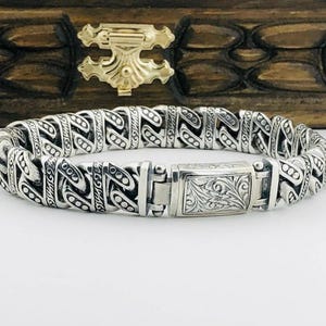 Product Details: • Material: 925 sterling silver • Design: Watch strap style • Weight: approx. 31.65 g • Size: 8.66 inch length x 0.39 inch width • Comes in a bracelet box • Origin: Turkey