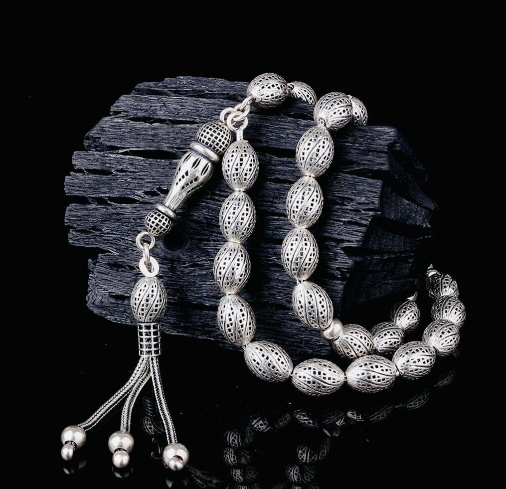 Description: This tasbih is crafted entirely from 925 sterling silver, featuring 33 arpa-cut beads sized 11 x 8 mm. With a weight of 34 g, it provides a solid and balanced feel in the hand. Designed for daily use, prayer, or as a collectible piece, this Fizyon cut silver tasbih is also an elegant gift option. Delivered in a stylish gift box.