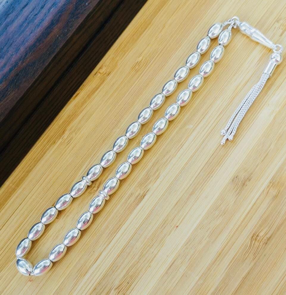 Description: This 925 sterling silver tasbih is crafted with elegant arpa-cut beads measuring 9 x 6 mm and weighs approx. With a total length of 24 cm, it is light, elegant, and easy to use. Perfect for daily prayer, meditation, or as a meaningful gift. A refined piece also suitable for collectors.
