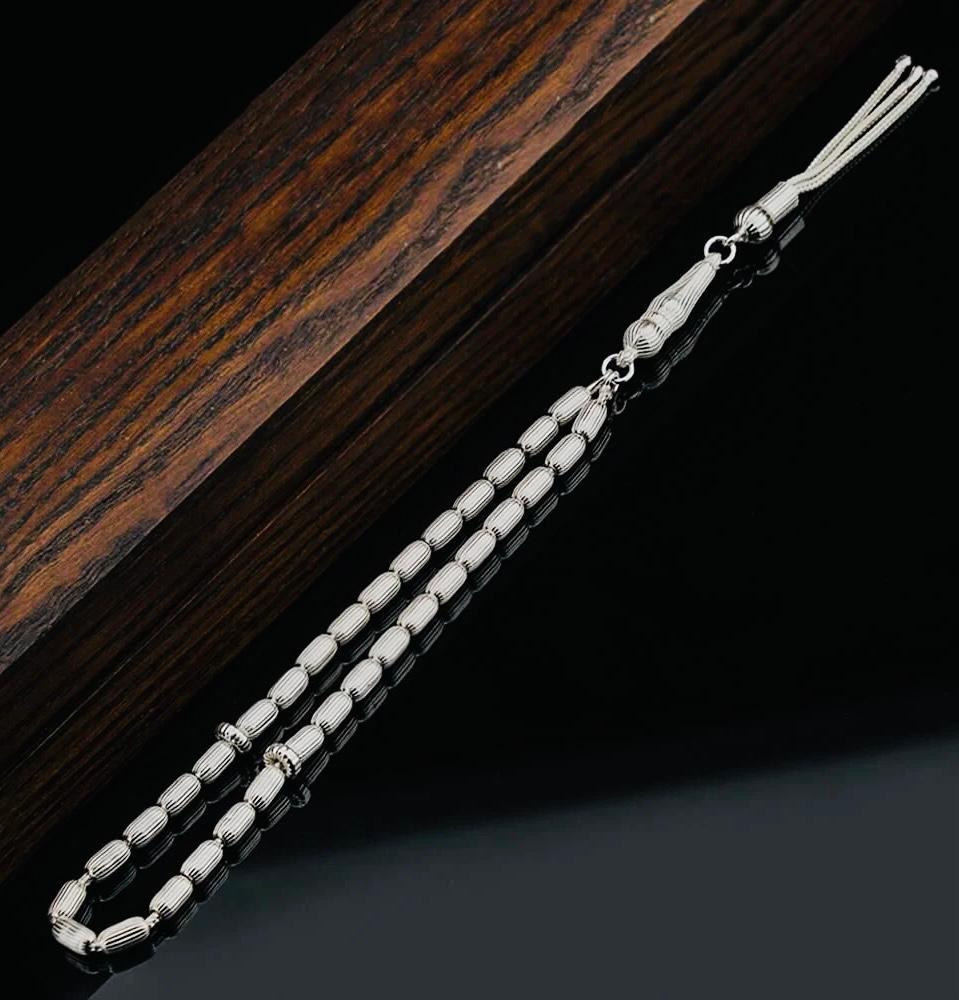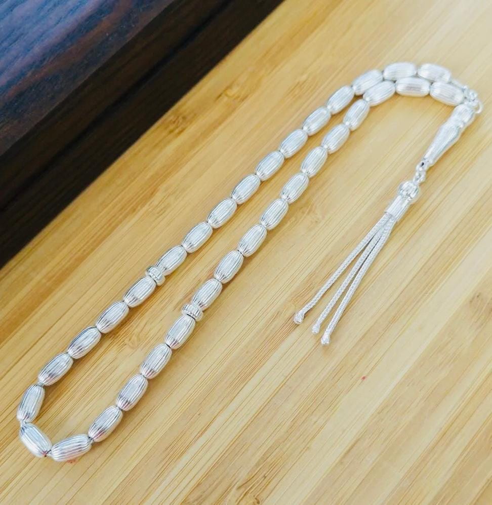 Description: This 925 sterling silver tasbih features elegant striped capsule-cut beads measuring 7.2 x 4 mm, weighing approximately With a total length of 20.5 cm, it offers a refined and comfortable feel in hand. Perfect for prayer, meditation, daily use, or as a unique gift for your loved ones.
