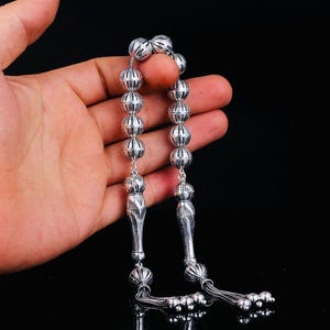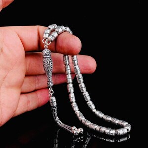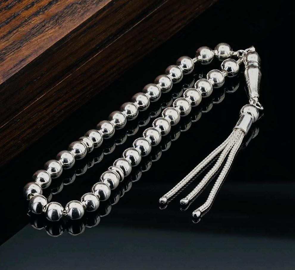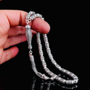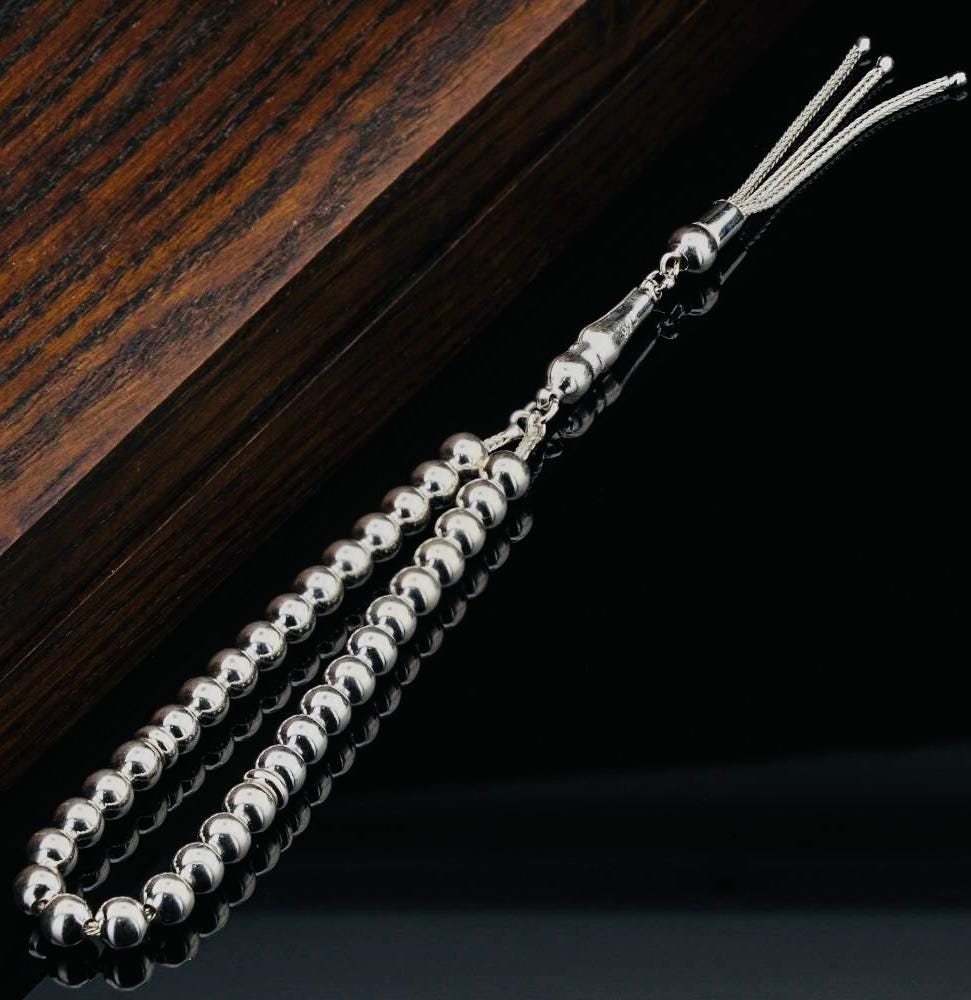 Description: This 925 sterling silver tasbih features 5x6 mm round-cut beads and weighs approximately . With a total length of 18.5 cm, it is lightweight and comfortable to carry. Perfect for prayer, meditation, or as a meaningful gift. Delivered in a stylish box, it is also suitable for collectors who value elegant craftsmanship.