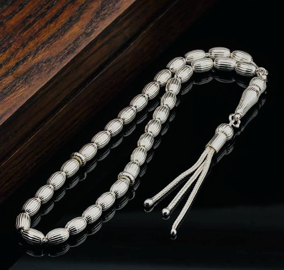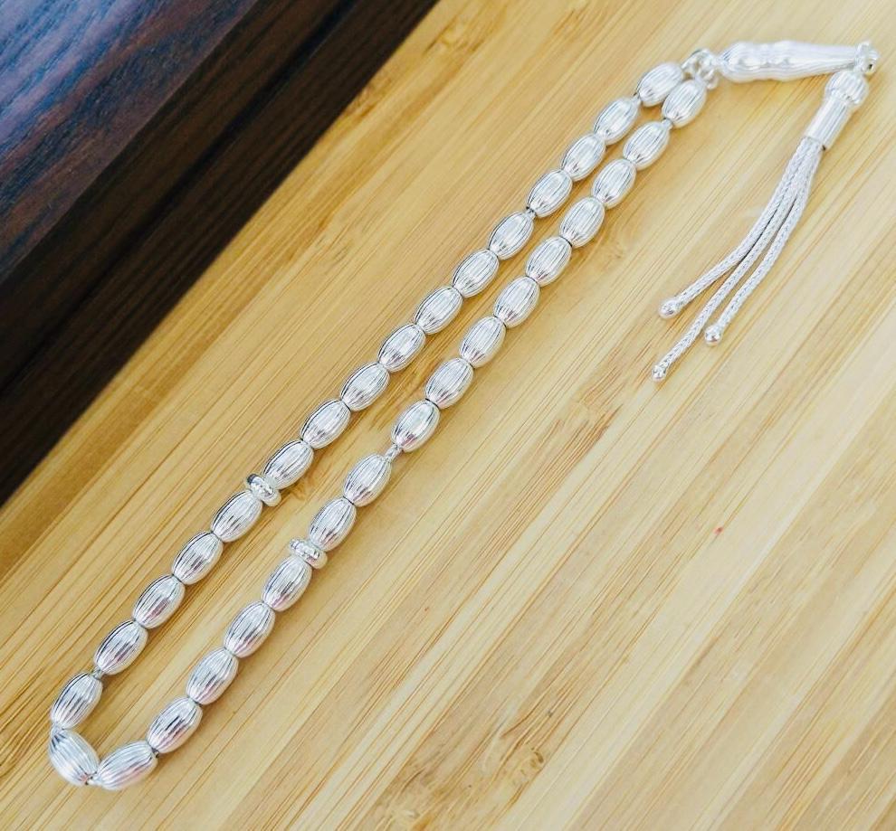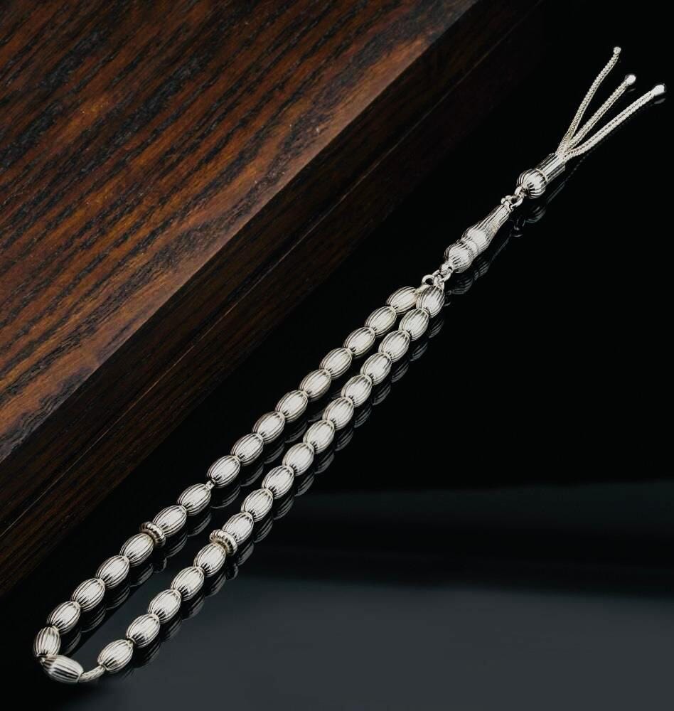 Description: This elegant tasbih is crafted from 925 sterling silver with a barrel-cut striped bead design. it is both a spiritual and aesthetic piece, perfect for daily use, prayer, meditation, or as part of a collection. Delivered in a stylish gift box, it also makes a meaningful gift for special occasions.