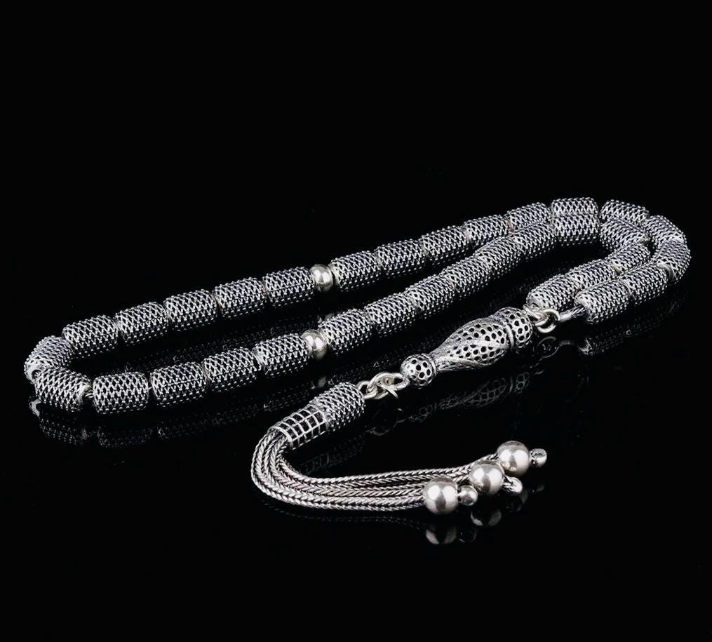 Description: This Capsule Cut Fusion Tasbih is handcrafted from 925 sterling silver and consists of 33 beads, each measuring 8x6 mm. With a total weight of length of 24 cm, it offers a refined and balanced design. Perfect as a daily prayer accessory, a collector’s piece, or a meaningful Islamic gift. Delivered in an elegant gift box.