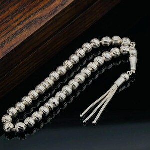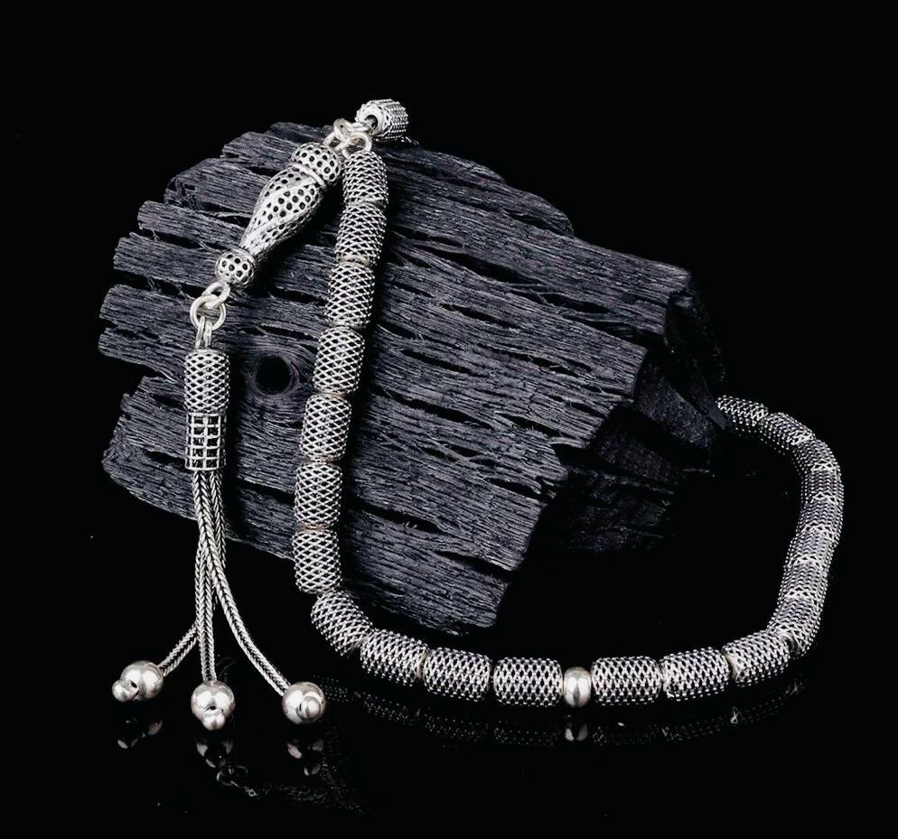Product Details: • Material: 925 sterling silver • Bead Size & Count: 8 mm x 6 mm – 33 beads • Length to Imame: 15 cm • Total Length: 24 cm • Comes in a gift box