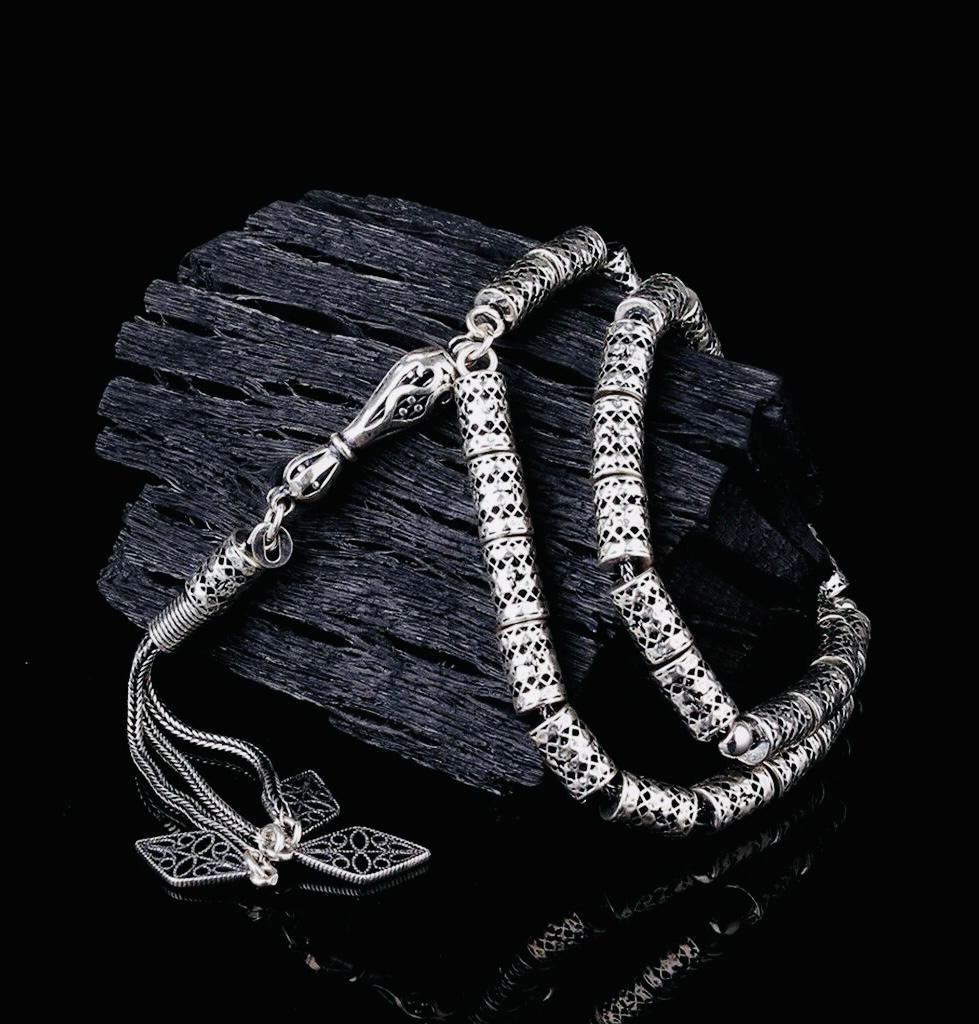 Description: Made entirely of 925 sterling silver, this Cylinder Fusion Cut Tasbih Model 2 features 33 beads sized 9 x 6 mm it offers a balanced and elegant feel in the hand. With its sleek cylinder cut design, it is both a valuable collector’s piece and a meaningful gift option. Delivered in a stylish gift box.
