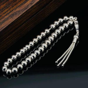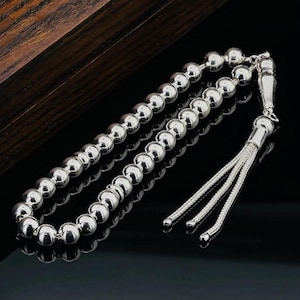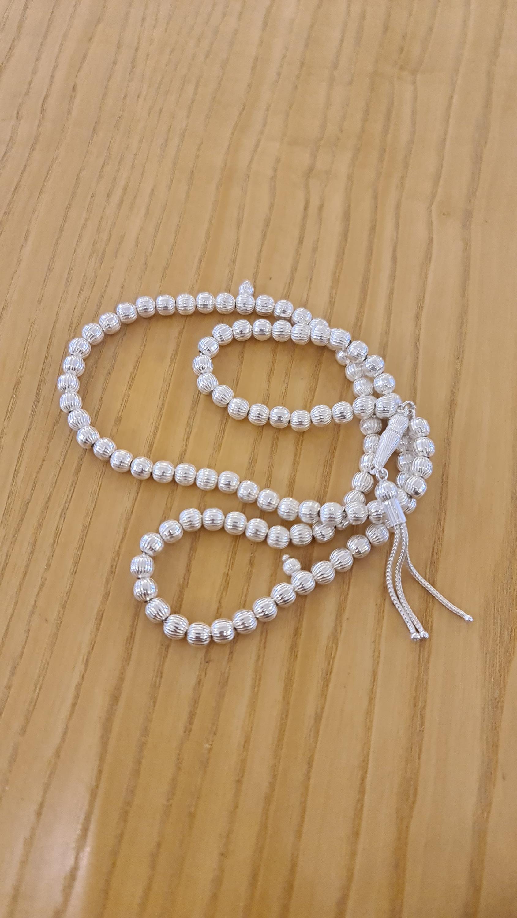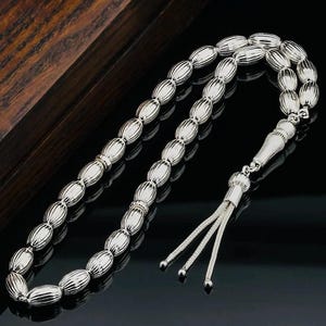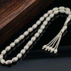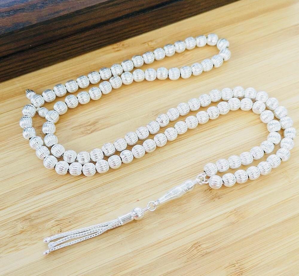 This 99-bead misbaha is crafted from solid 925 sterling silver with a unique striped bead design. It weighs features 6 mm beads, offering elegance and durability. Ideal for prayer, meditation, or as a special gift.