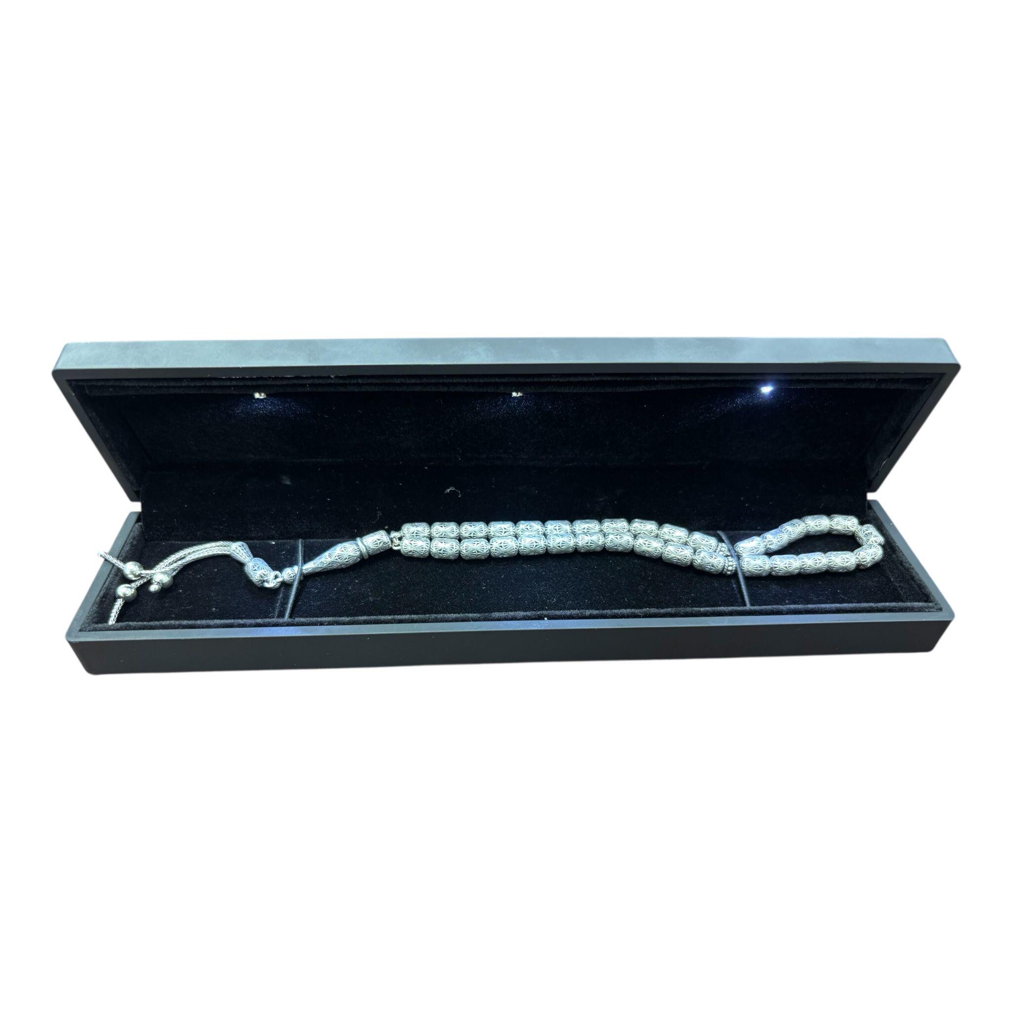 Description: This elegant tasbih is crafted entirely from 925 sterling silver, featuring 8 mm beads and weighing Its high-quality finish makes it both functional for daily use and a valuable collector’s piece. Delivered in a stylish gift box, making it perfect for gifting.