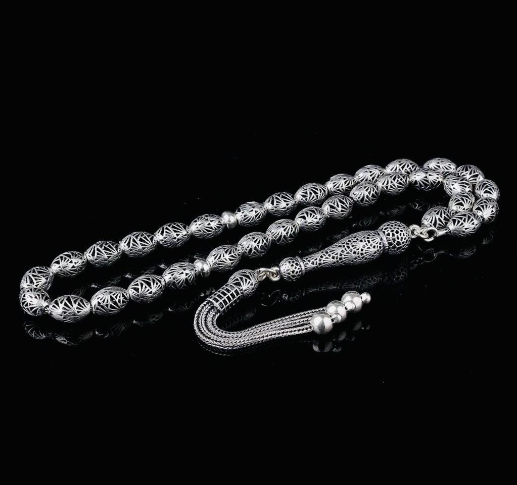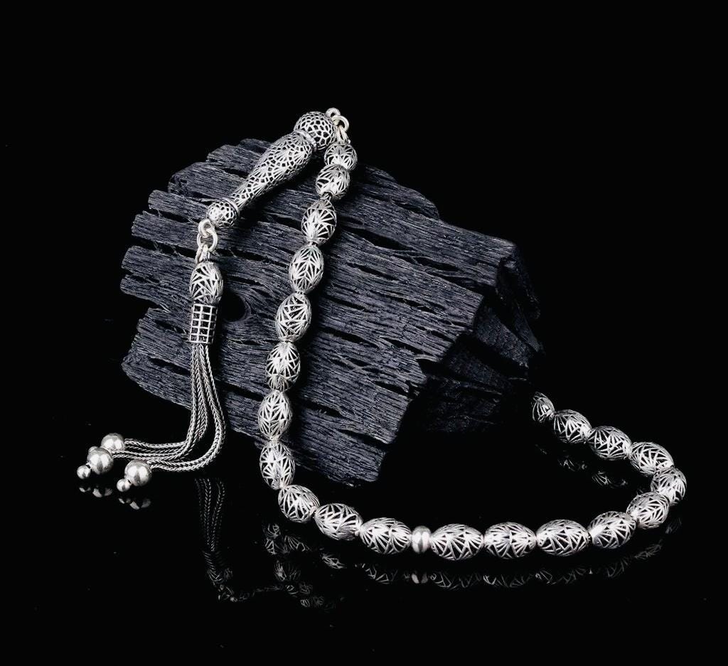 Description: This Arpa cut Fizyon misbaha is entirely crafted from 925 sterling silver. With 33 elegant beads and refined craftsmanship, it is perfect for daily use, spiritual practices, or as a collectible piece. Delivered in a stylish gift box, it also makes a thoughtful gift for your loved ones.