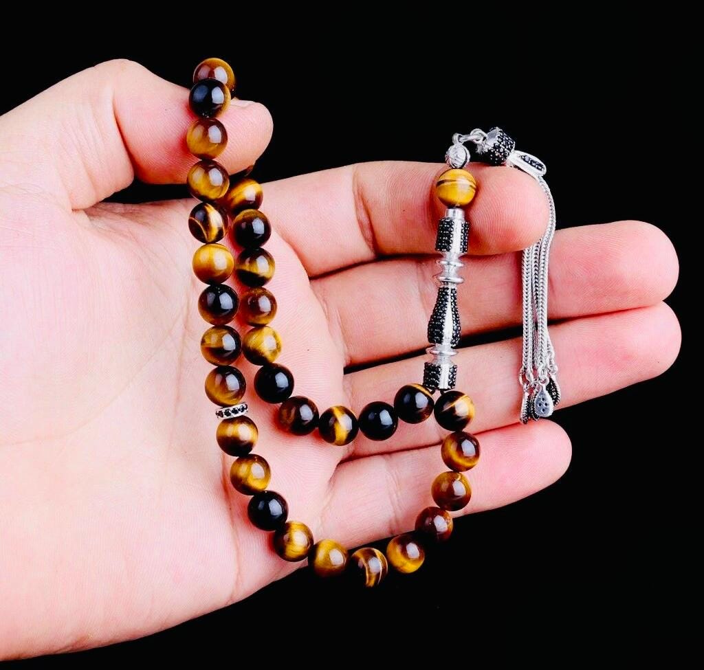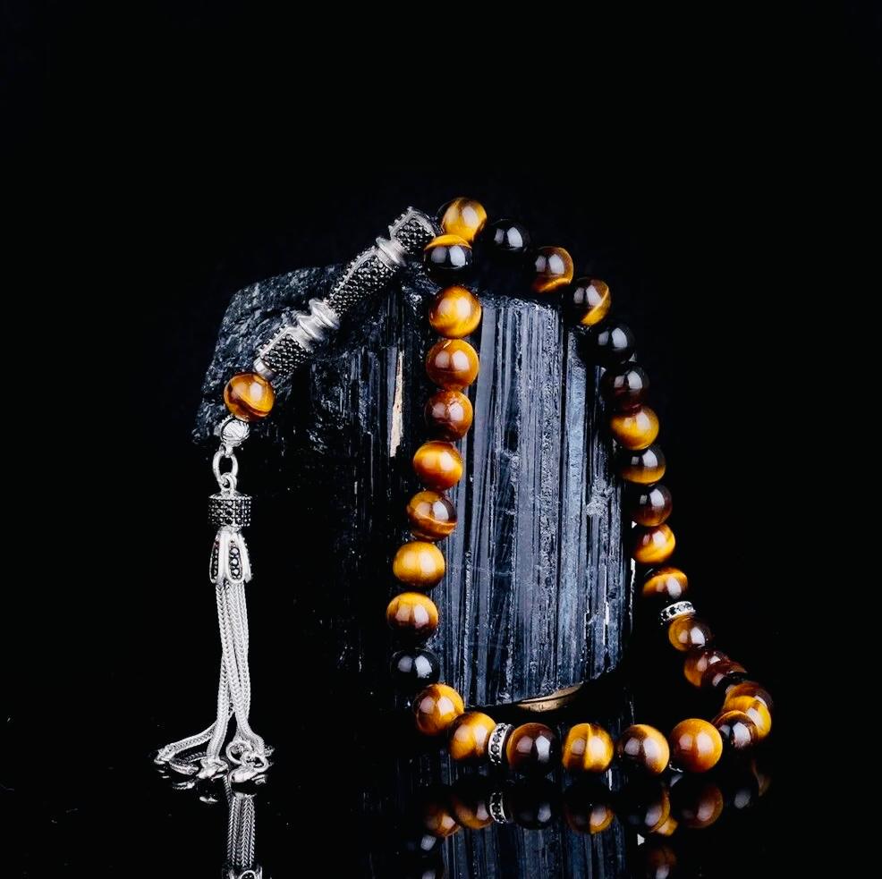 This misbaha is made from natural Tiger Eye stones, featuring a sterling silver tassel adorned with zircon stones. Its shimmering look makes it perfect for prayer, meditation, or as a meaningful gift.