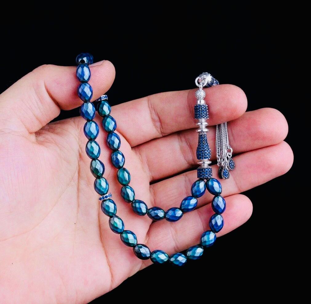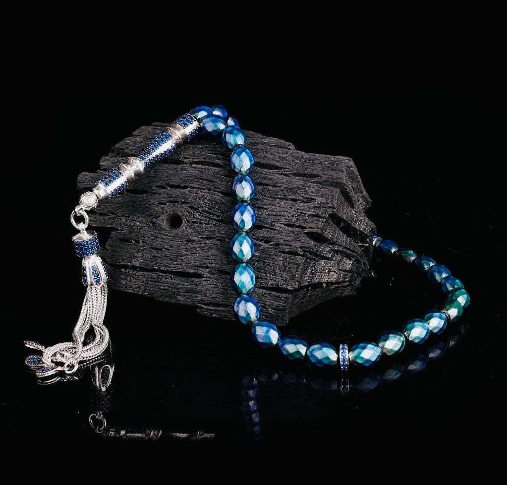 This elegant arpa-cut misbaha features unique color-changing beads paired with a sterling silver tassel and zircon detail. A perfect blend of tradition and modern elegance, suitable for prayer, meditation, or as a meaningful gift.