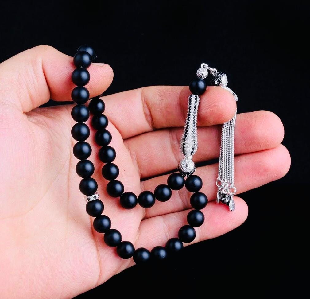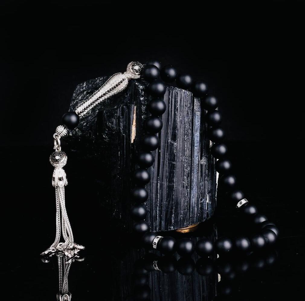 Matte Onyx Misbaha – 925 Silver Tassel with Zircon – 8 mm – 24 cm