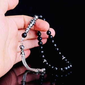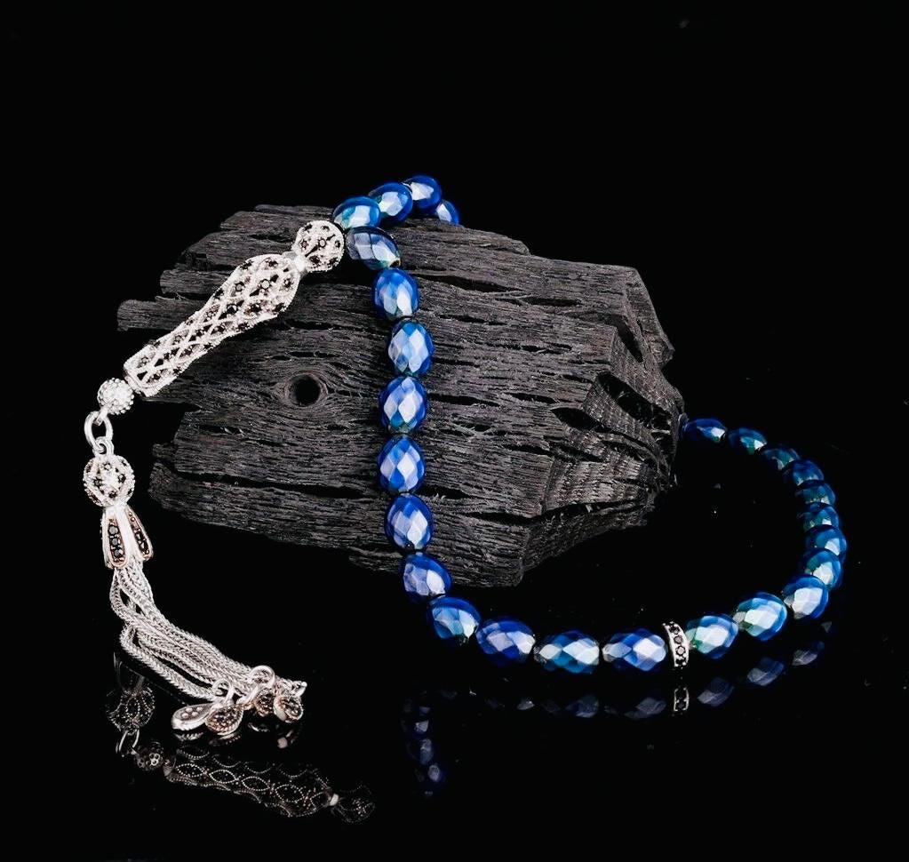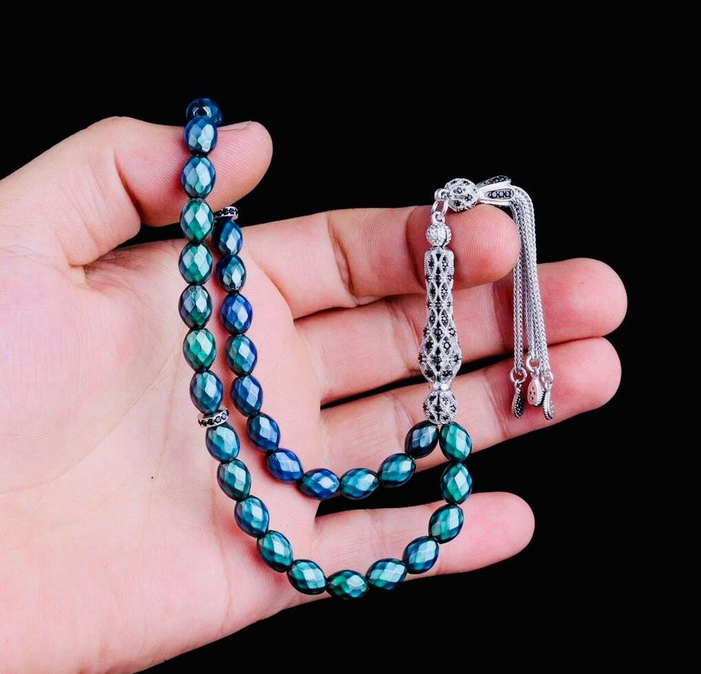 This unique arpa-cut misbaha features color-changing resin beads combined with a sterling silver tassel decorated with zircon details. A stylish and meaningful accessory, perfect for prayer, meditation, or as a thoughtful gift.