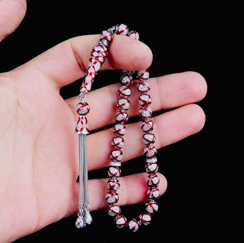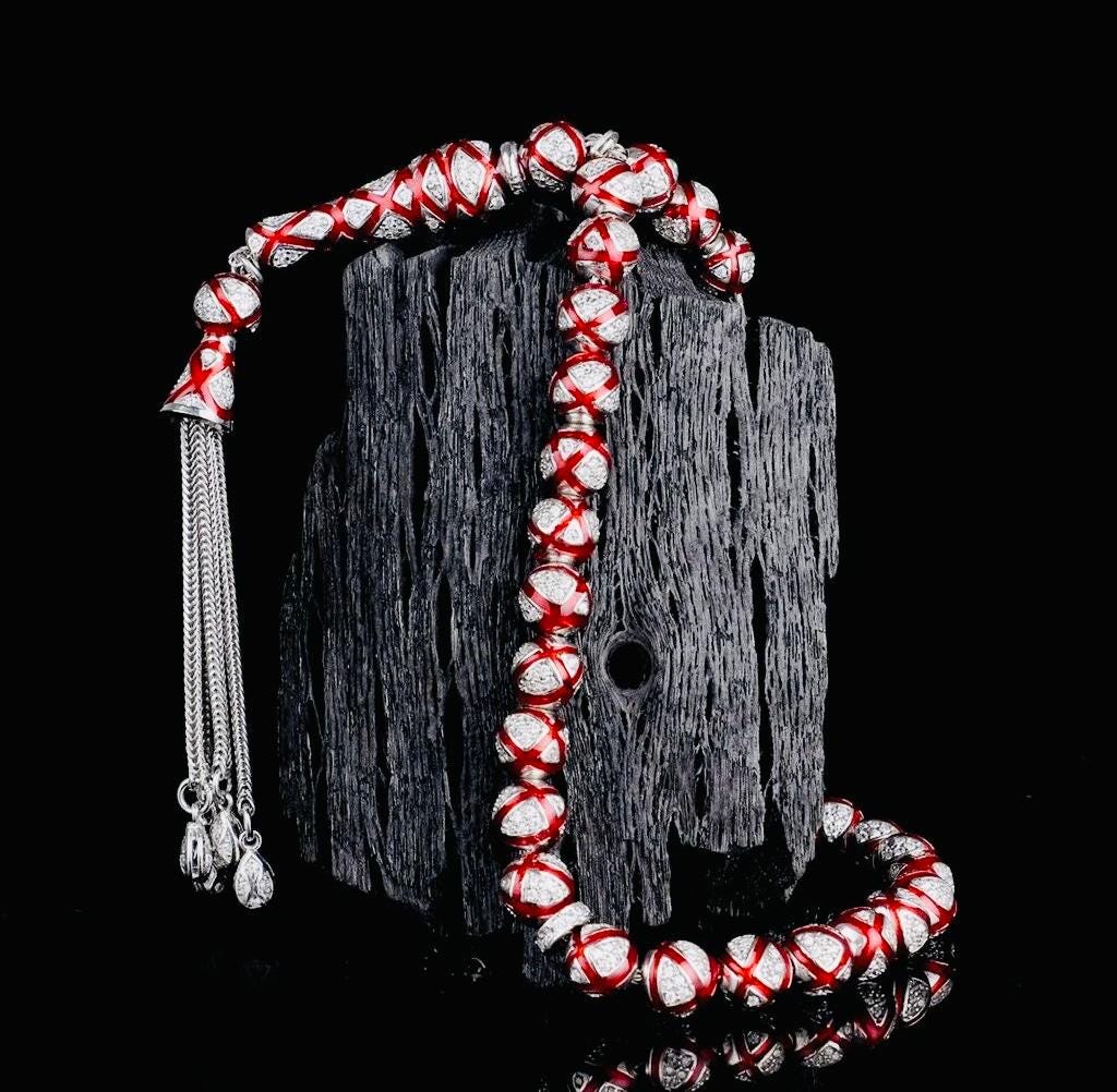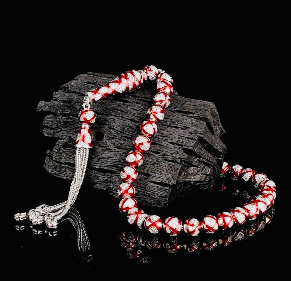This handcrafted misbaha is made of solid 925 sterling silver with a red enamel finish and zircon stone detailing. A perfect blend of elegance and durability, ideal for prayer, meditation, or as a thoughtful gift.